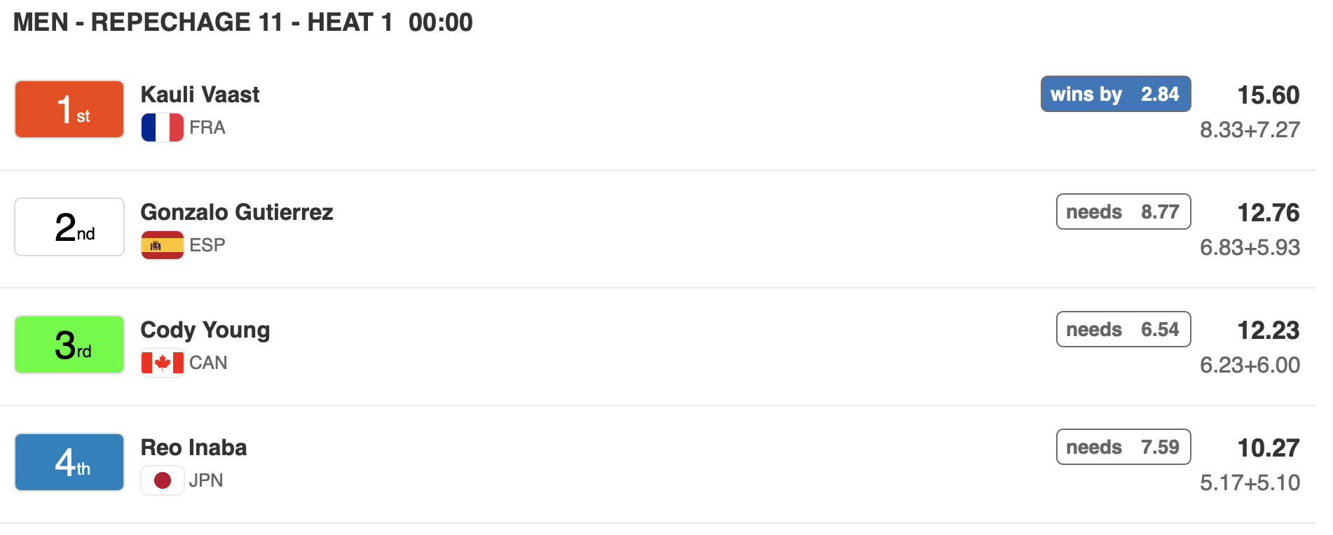 5.17ptと4.57ptをまとめたものの、ヒート後半にKauli Vaastが7.27pt、さらに8.33ptのエクセレントスコアを叩き出して一気に1位のポジションへ。