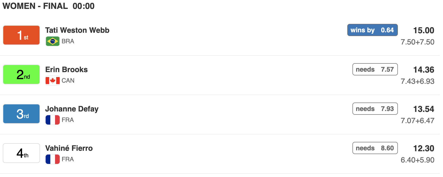 またWOMENSはブラジルのTatiana Weston-Webbが金メダリストに輝き、カナダのErin Brooksが銀メダル、フランスのJohanne Defayが銅メダル、フランスのVahine Fierroが4位という結果となった。