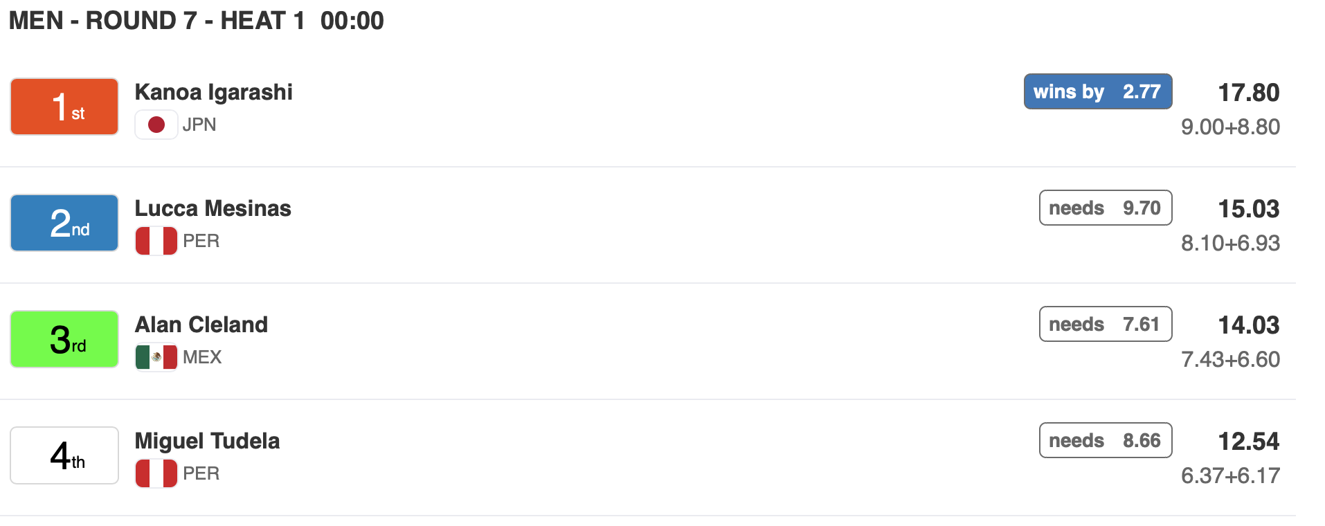 迎えたファイナルでもその快進撃に期待が掛かったが、8.00ptのエクセレントスコアをマークしたもののバックアップを伸ばす事ができなかった上、メキシコのAlan Clelandが9.73ptと8.50ptとエクセレントスコア2本を決めた上、ペルーのLucca Mesinasも9.10ptと7.07ptを叩き出すなど流れを掴む事ができず4位で今大会をフィニッシュ。