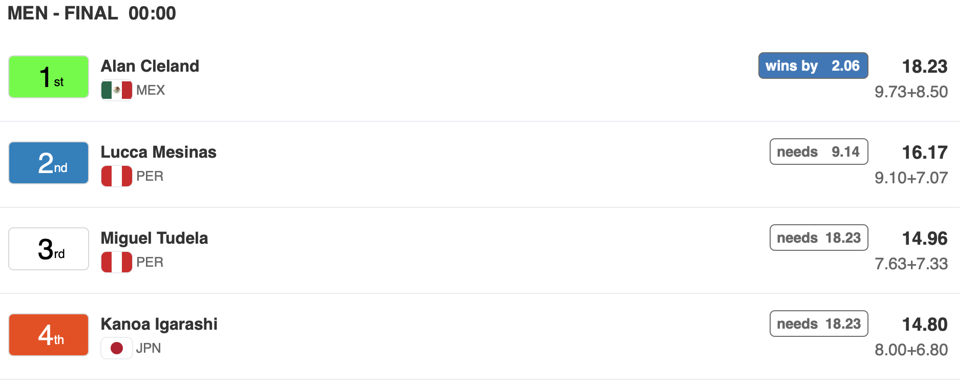 今大会の結果はMENSでメキシコのAlan Clelandが金メダルを獲得。