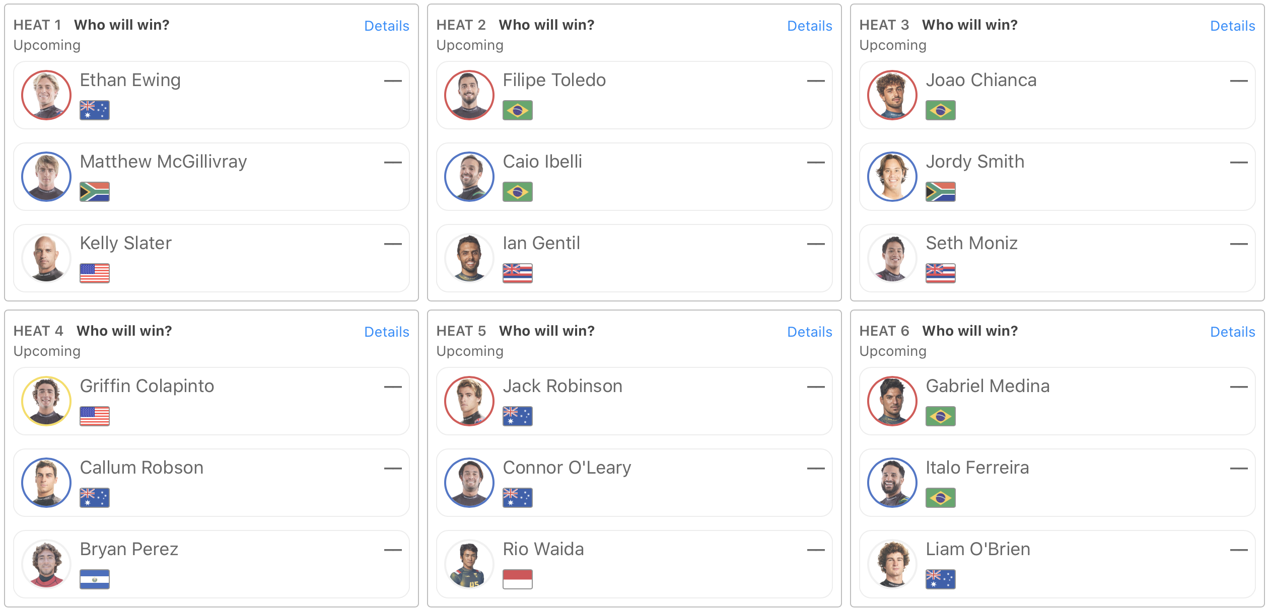 また、ヒート1にはEthan Ewing、Kelly SlaterにMatthew McGillivrayが組み込まれ、続くヒート2にはFilipe Toledoが登場。