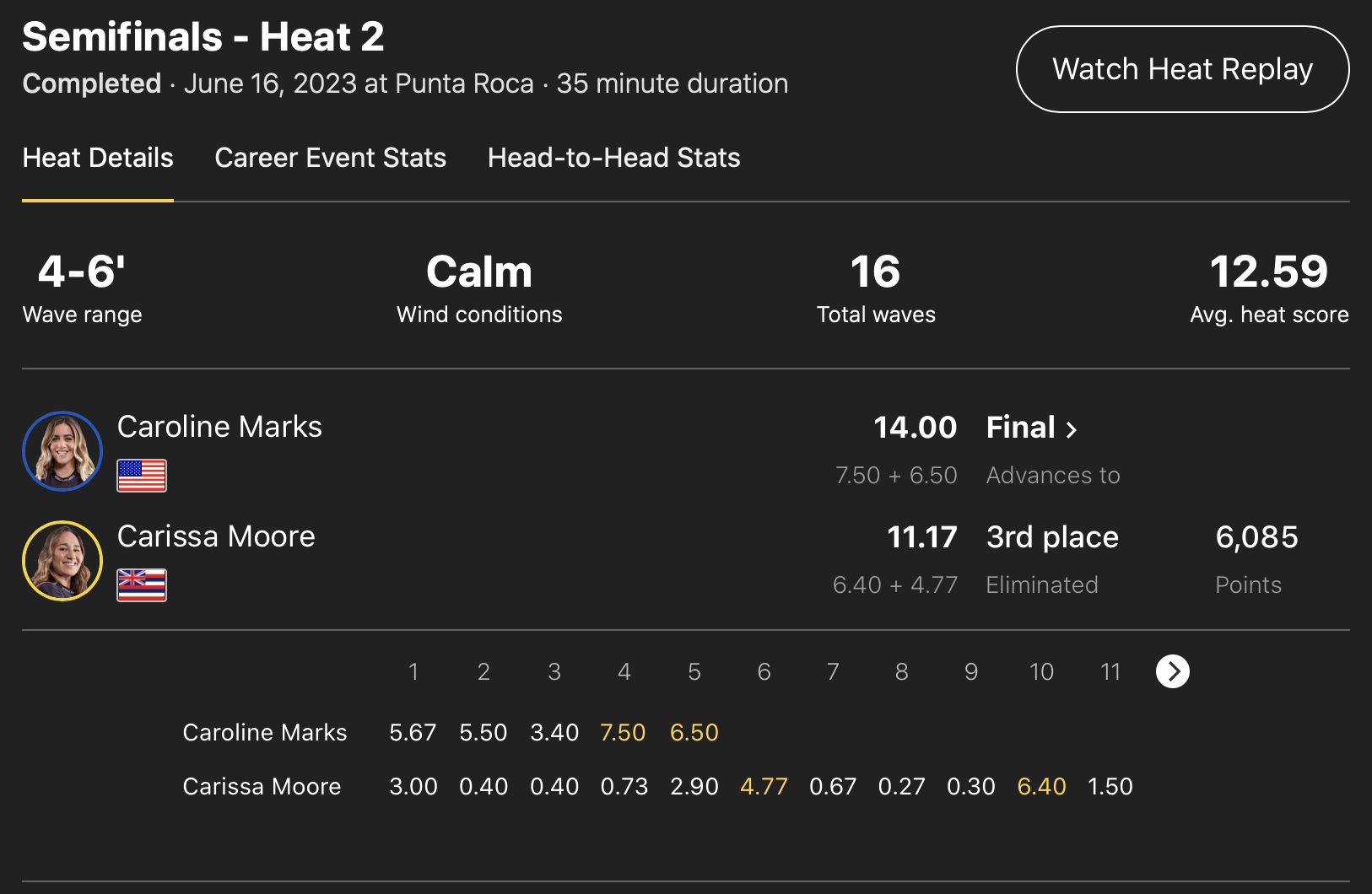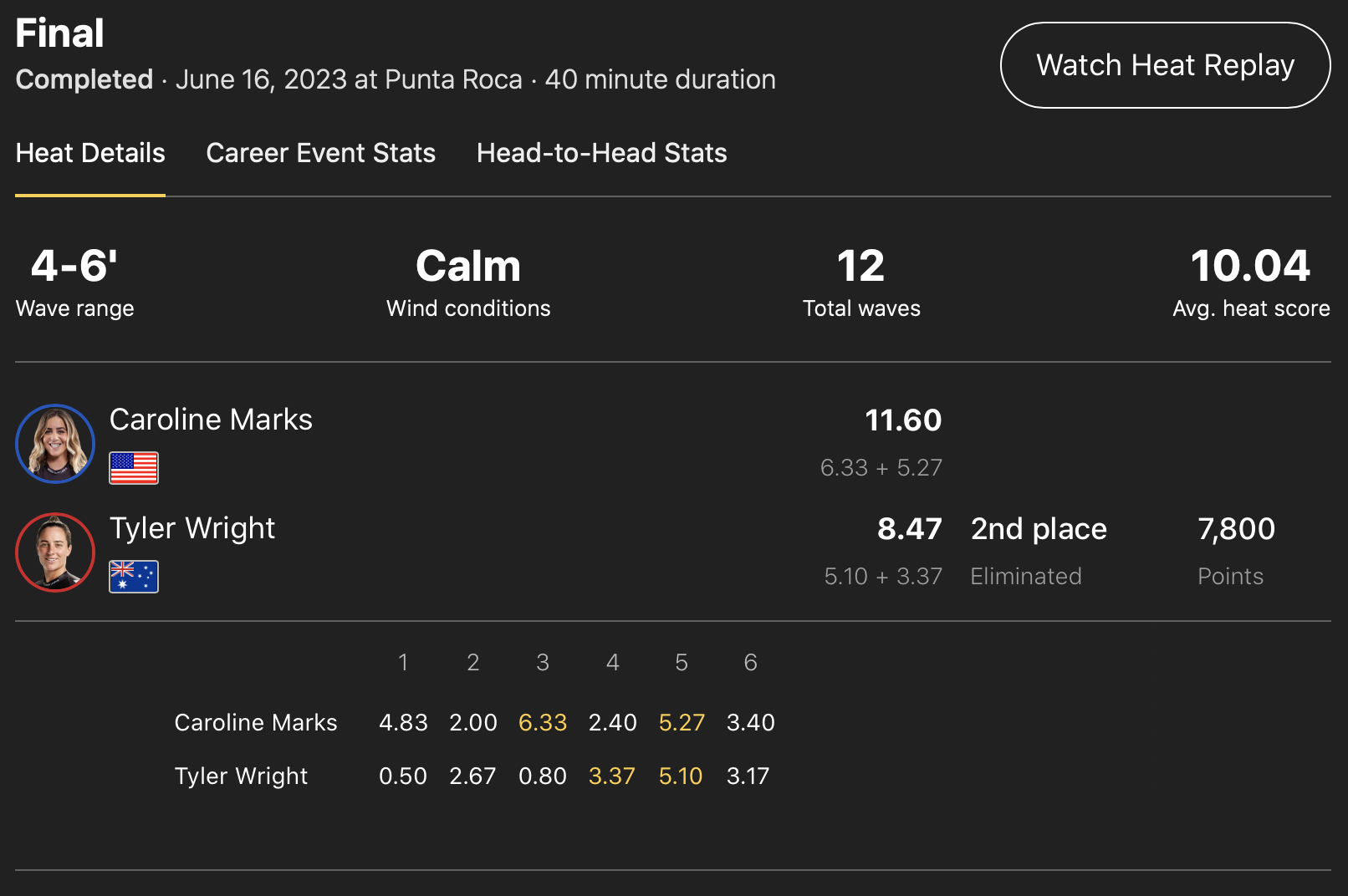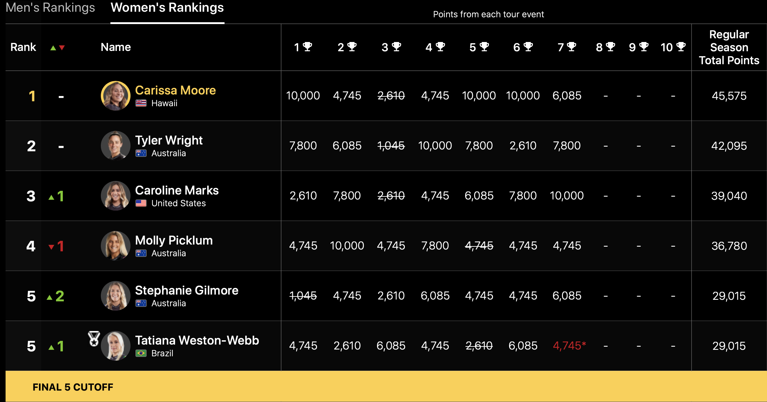 1位はCarissa Moore、2位にTyler Wright、4位にMolly Picklum、同率5位にStephanie GilmoreとTatiana Weston-Webb、7位にCaitlin Simmersとなっている。