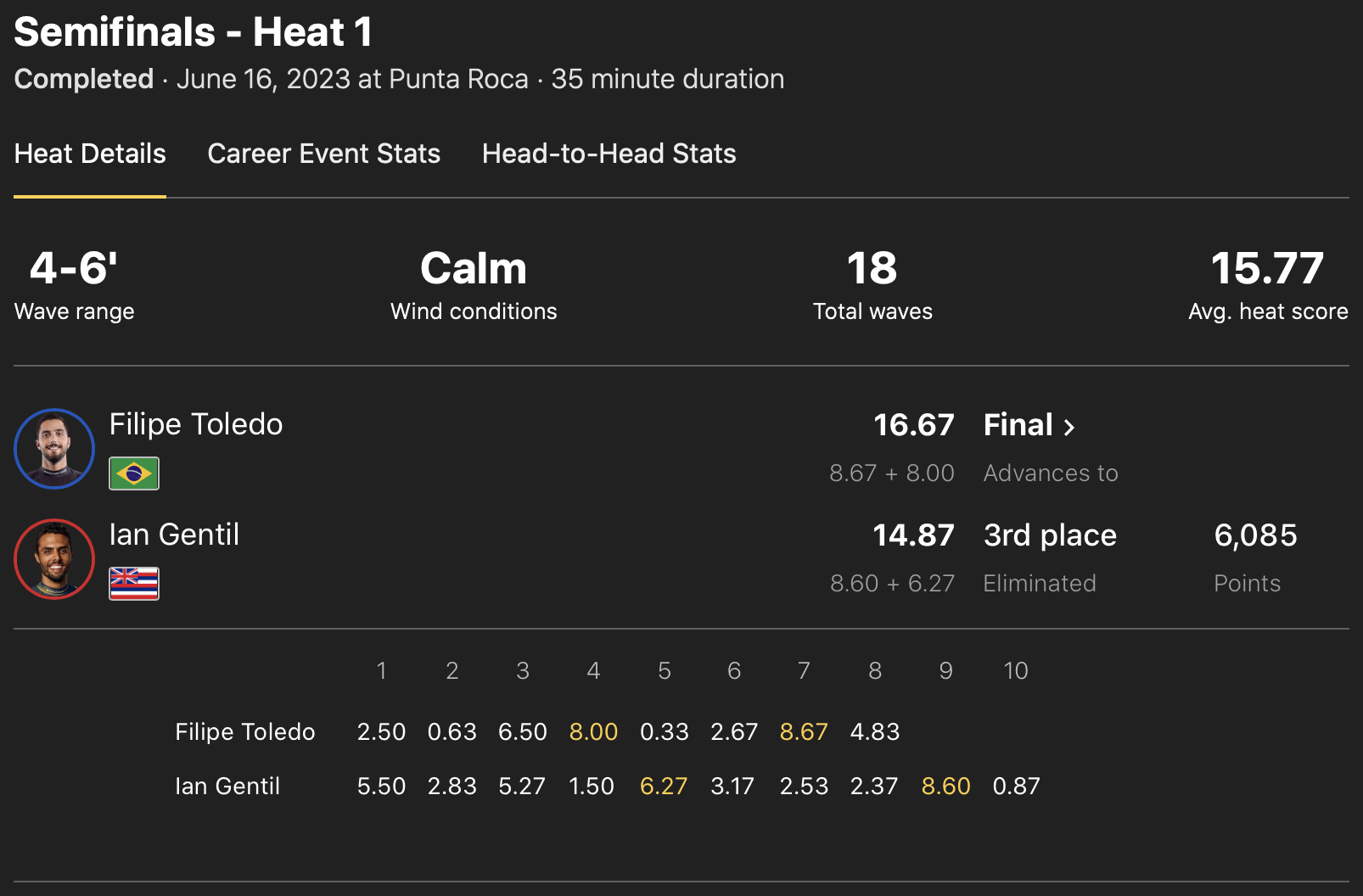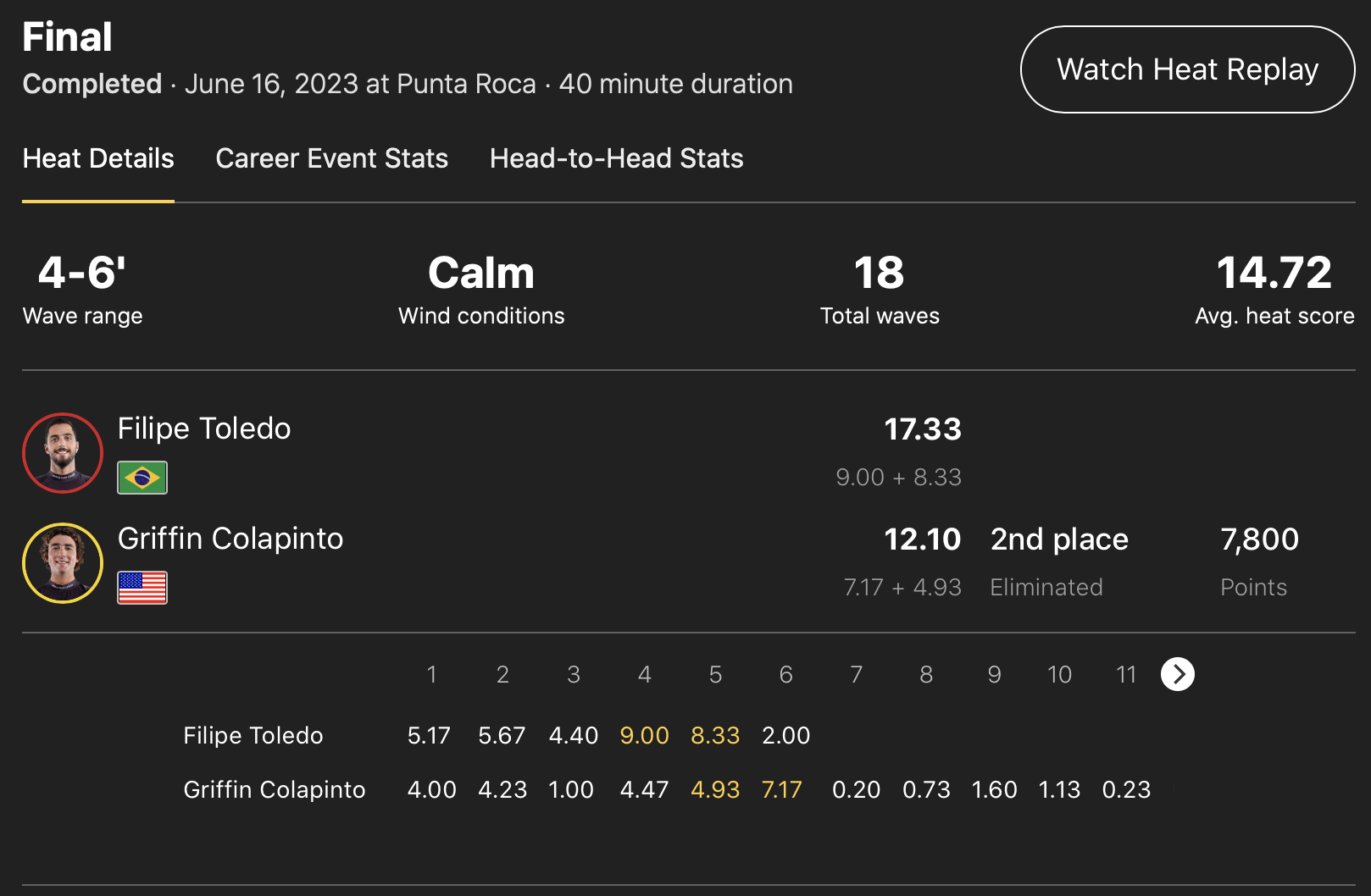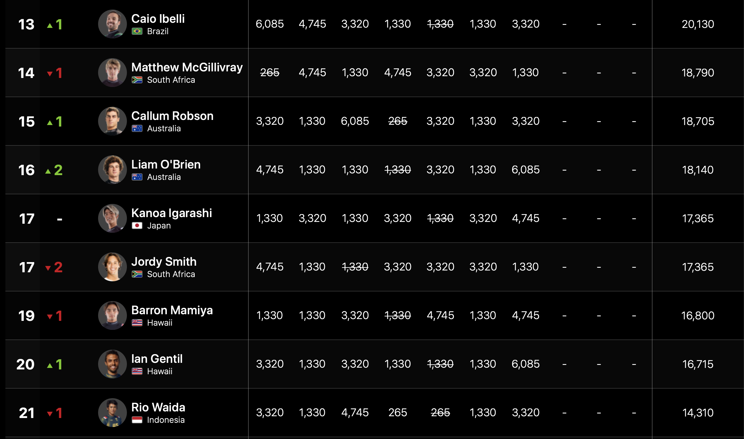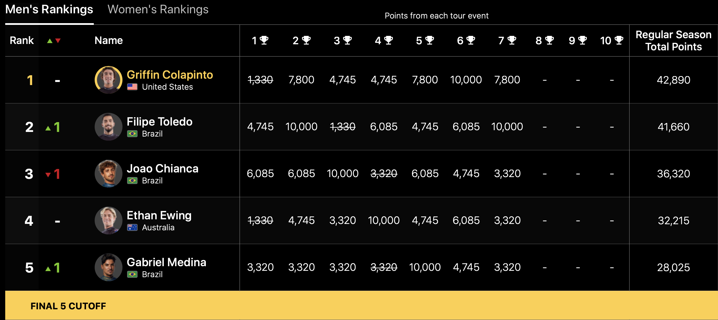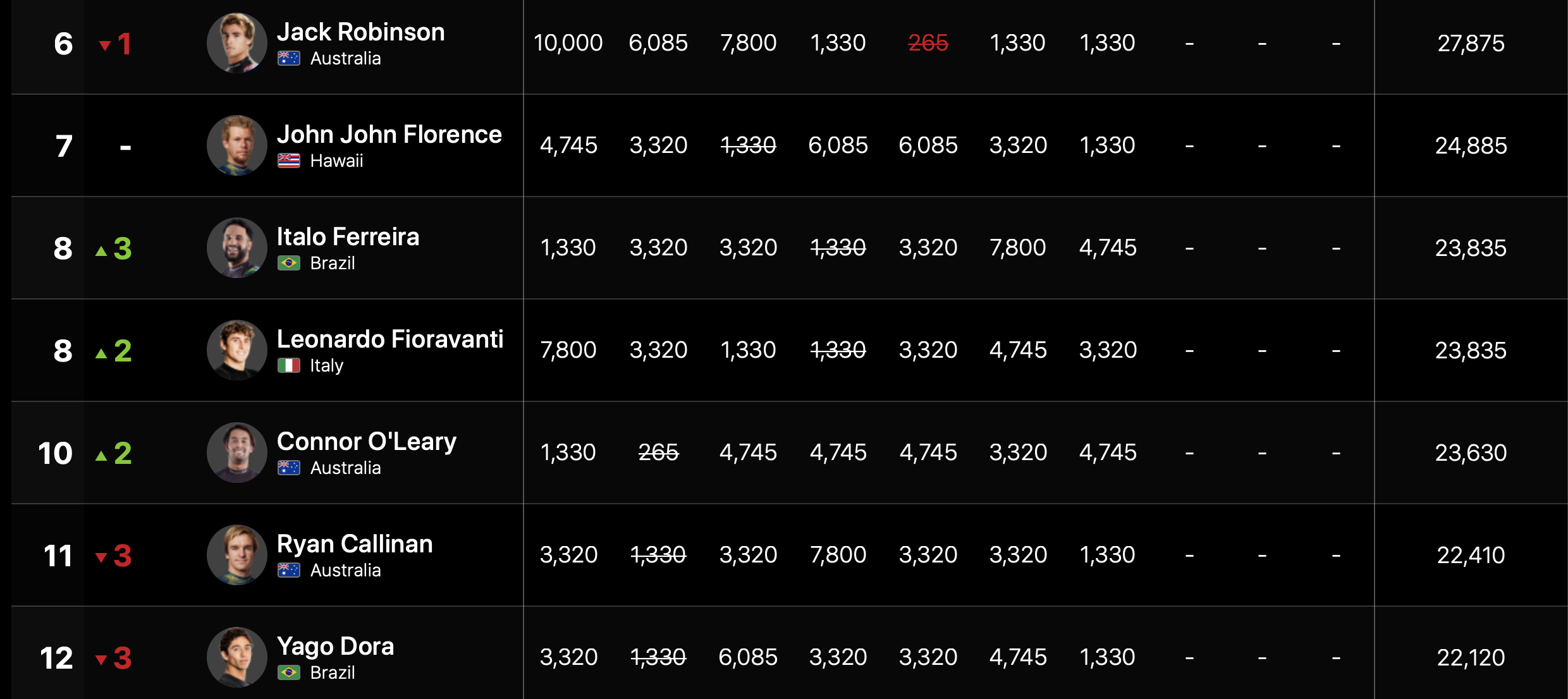 ランキングトップは依然としてGriffin Colapintoがキープしている中、3位にJoao Chianca、4位にEthan Ewing、5位にGabriel Medina、6位にJack Robinson、7位にJohn John Florence、同率8位にItalo FerreiraとLeonaardo Fioravantiとなっている。