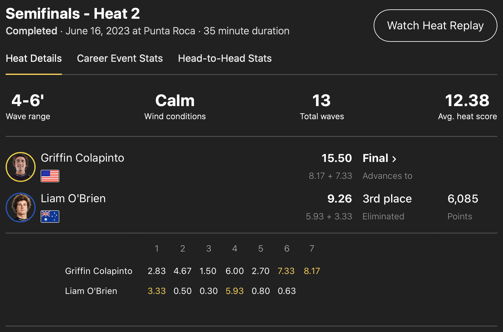 注目の日本人選手はConnor O’leatyが10位、五十嵐カノアが17位、和井田理央が21位にポジションしている。