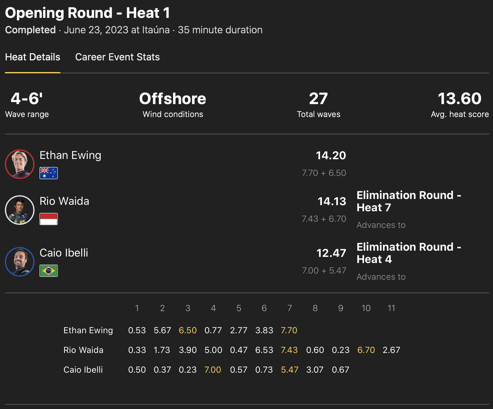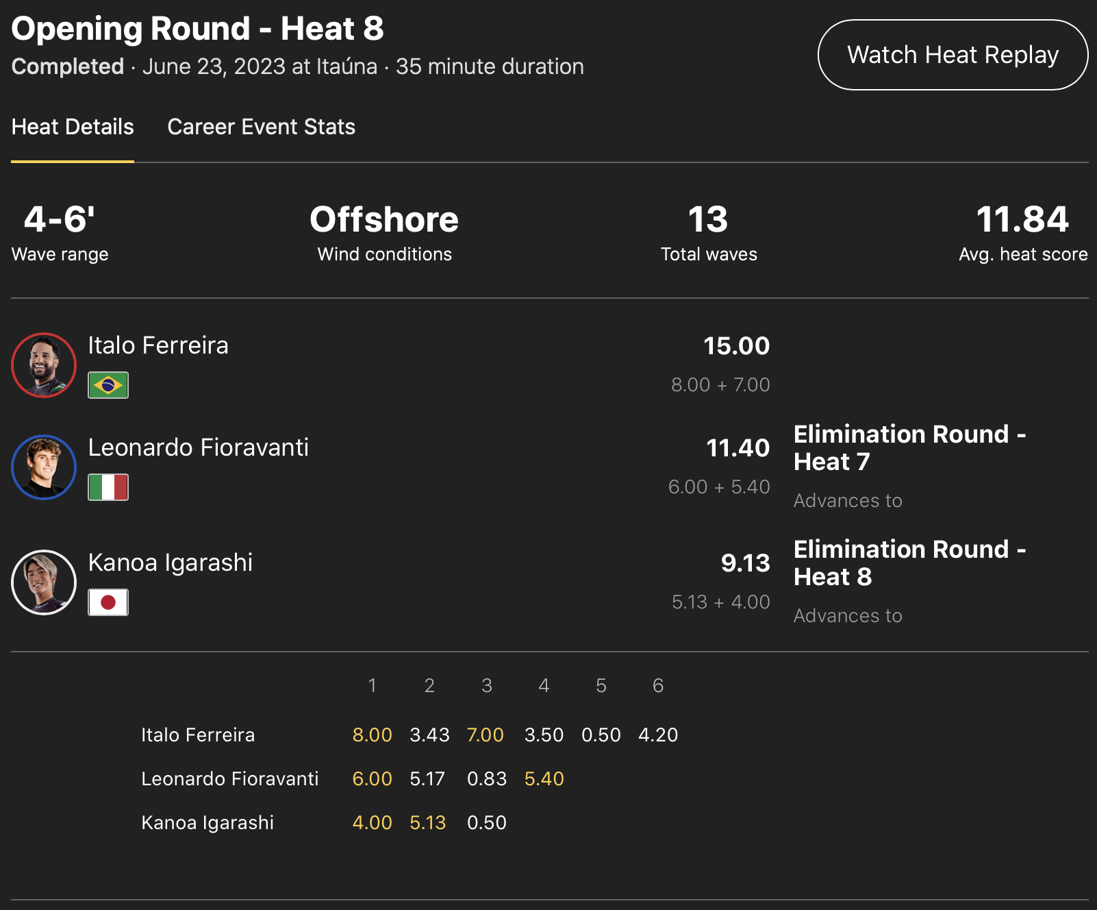 注目の五十嵐カノアはヒート8でItalo Ferreira、Leonardo Fioravantiと対戦となり、いい波を全く掴むことができず3位となってイリミネーションラウンドへと。
