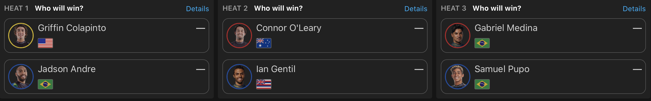 ヒート7で和井田理央がLeonardo Fioravantiと、ヒート8では五十嵐カノアがCallum Robsonと対戦予定となっている。