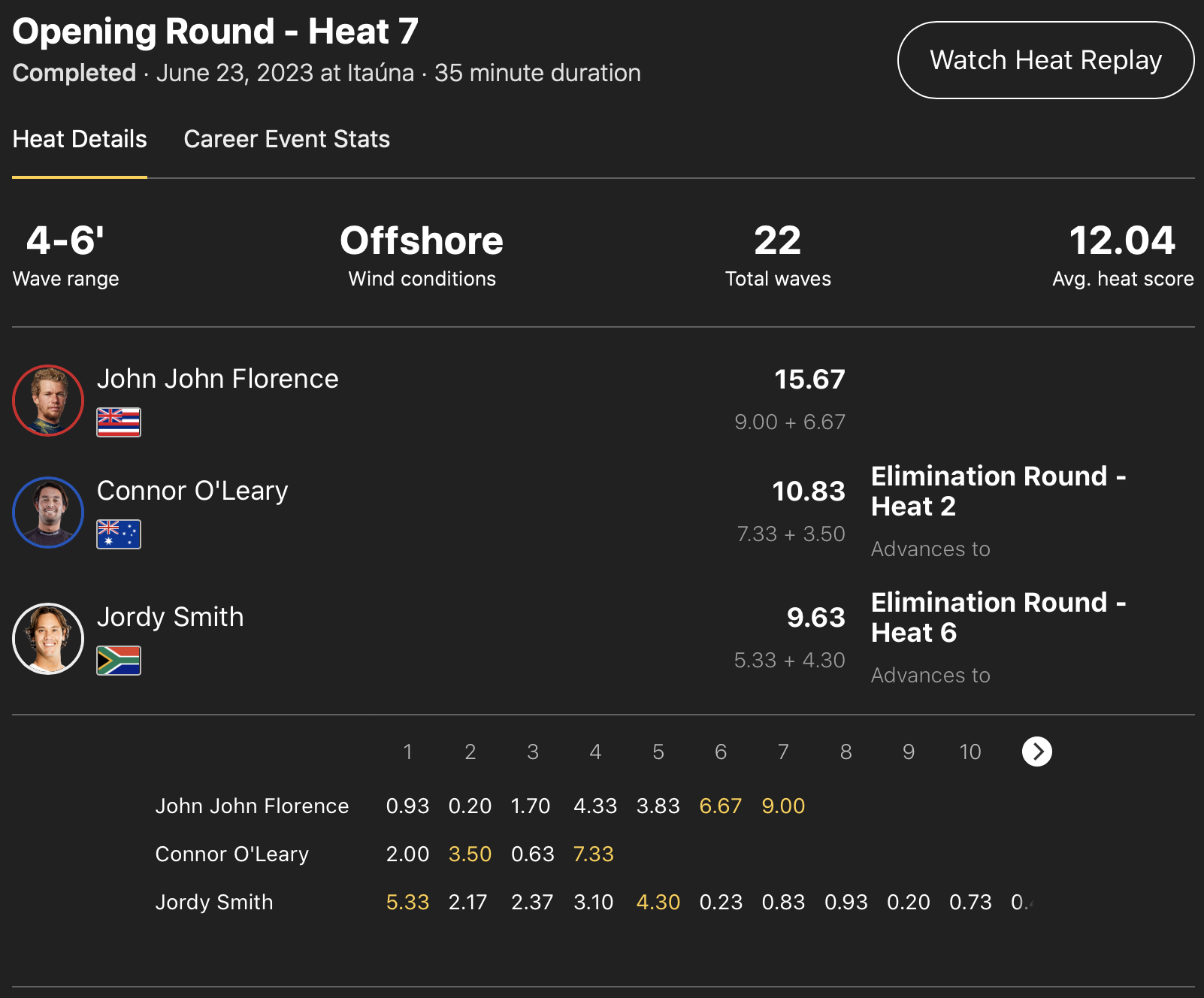 ヒート7のConnor O’learyもこの日のハイエスト・トータルスコアを叩き出したJohn John Florenceに逆転することができず、イリミネーションラウンドへと駒を進めた。