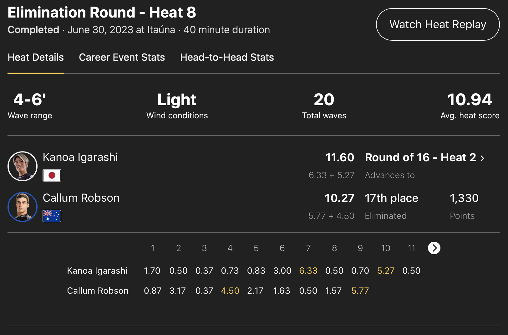 Ryan Callinanが5本目の波でビッグレイバックを決めるとそれが7.67ptのグッドスコアをマークし、五十嵐カノアが逆転に必要なスコア5.58ptという状況に追い込まれた中、ヒート終了間際に掴んだ4本目の波をインサイドまできっちり技を入れて乗り継ぎ、これが600pt前後出て逆転したかと思われたが、なんと5.27ptとあと一歩及ばず、悔しくもここで敗退する形となってしまった。