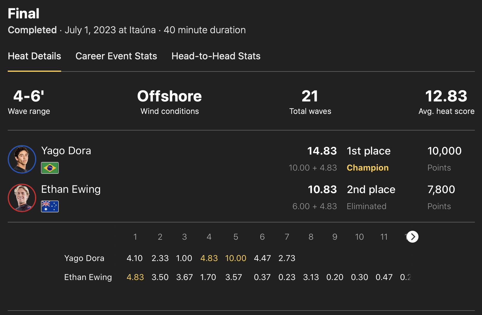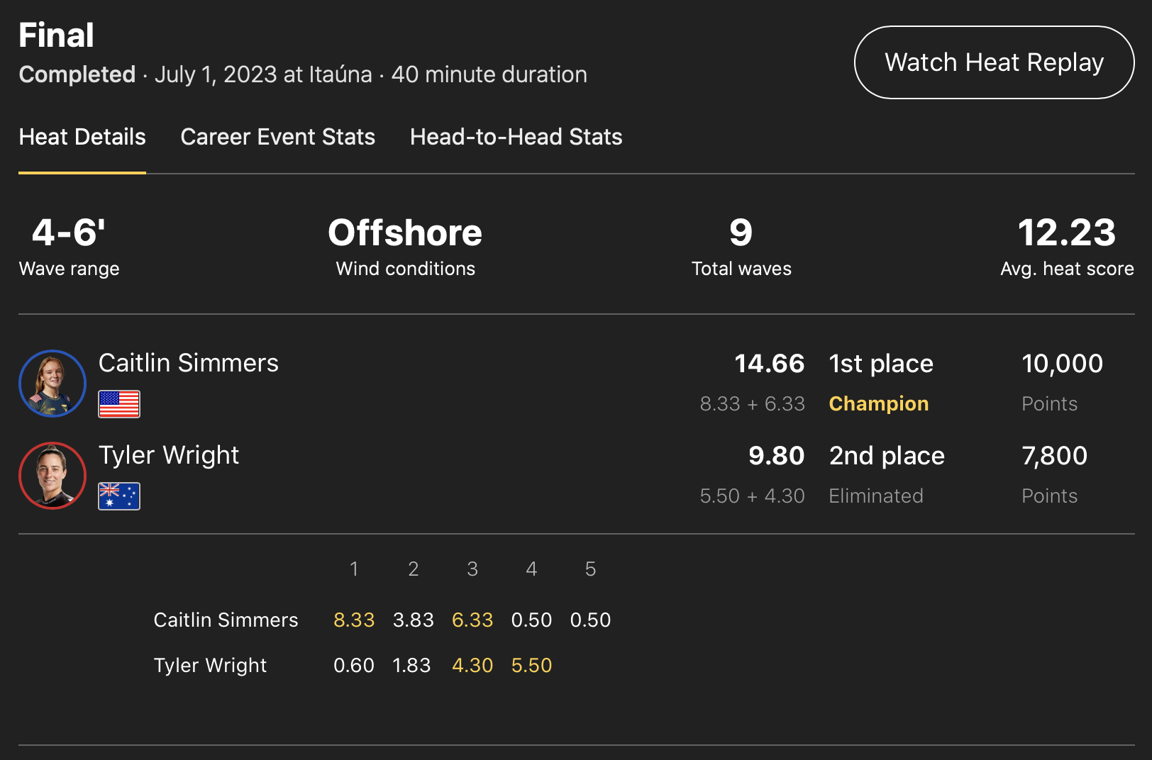 前日のDAY2とは打って変わってオフショアのクリーンなセットでオーバーヘッドのグッドコンディションで行なわれた中、MENSはテイクオフしてすぐにフロントサイドのビッグ・不ルローテーションエアをメイクして10ptを叩き出したYago Doraが、WOMENSはCaitlin Simmersが共に自身初となるCT優勝を決めた!