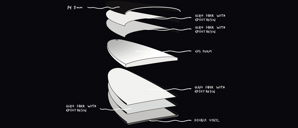 ボトム面もトップと同じく2層のクロスをエポキシ樹脂でグラスし、duplo vinilボトムを使用していることから、今乗っているボードよりも間違いなく速くテイクオフでき、より多くの波をキャッチ可能なだけでなく、波に乗ってからは通常のボードと同じような乗り味を提供。