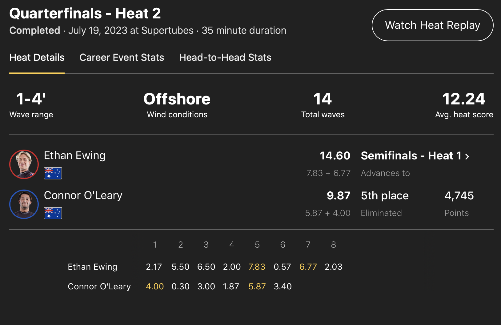 セミファイナルでは1本目に8.00ptのエクセレントスコアを叩き出してプライオリティーを持ち、じっくりいい波を待つ作戦でリードを保ったものの、Filipe Toledoの勢いをあと一歩のところで止めることができず、3位で今大会をフィニッシュとなった。