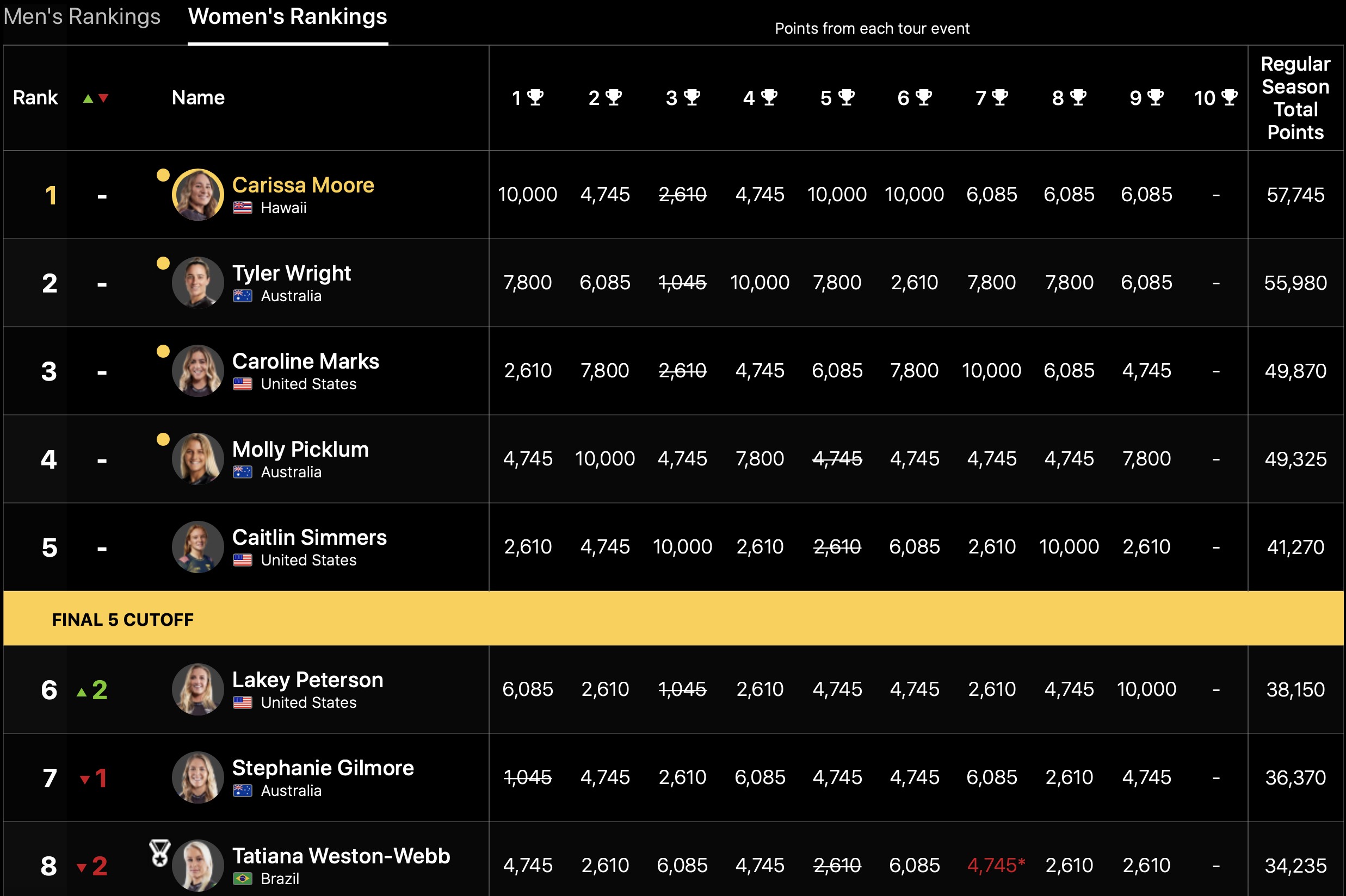 WOMENSでは1位のCarissa Moore、2位のTyler Wright、3位のCaroline Marks、4位のMolly PicklumまでがWSL FINALS出場決定となった。