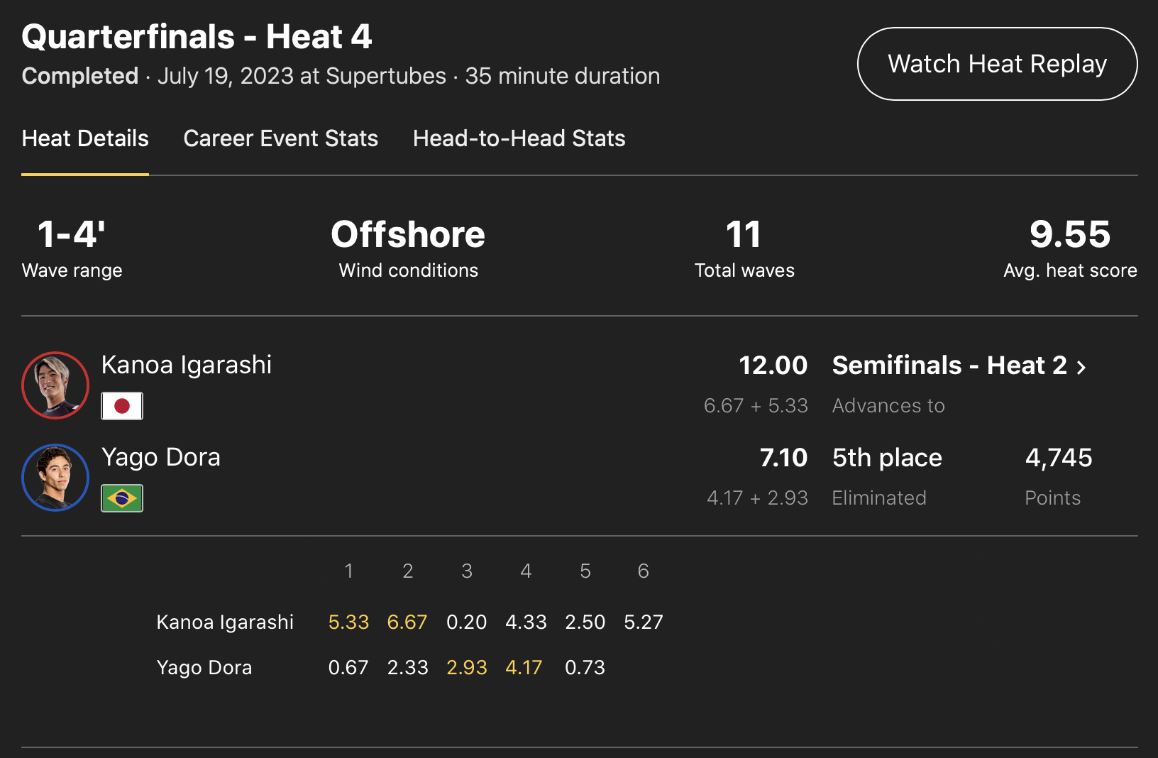 注目の日本人選手たちの活躍は、クォーターファイナルでYago Doraを抑えた五十嵐カノアがセミファイナルへ進出!