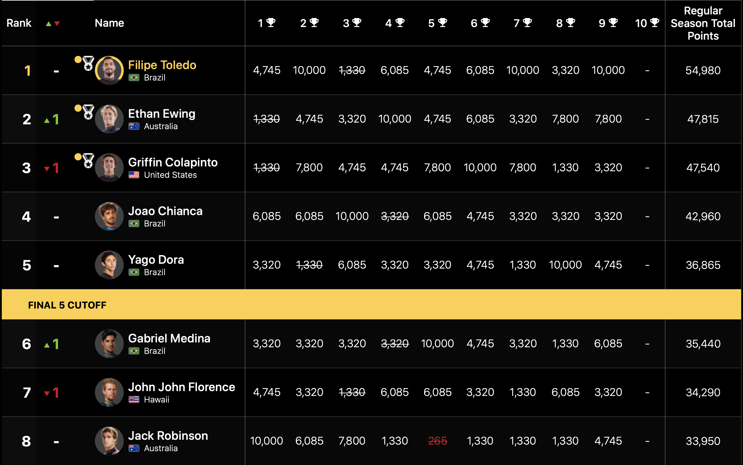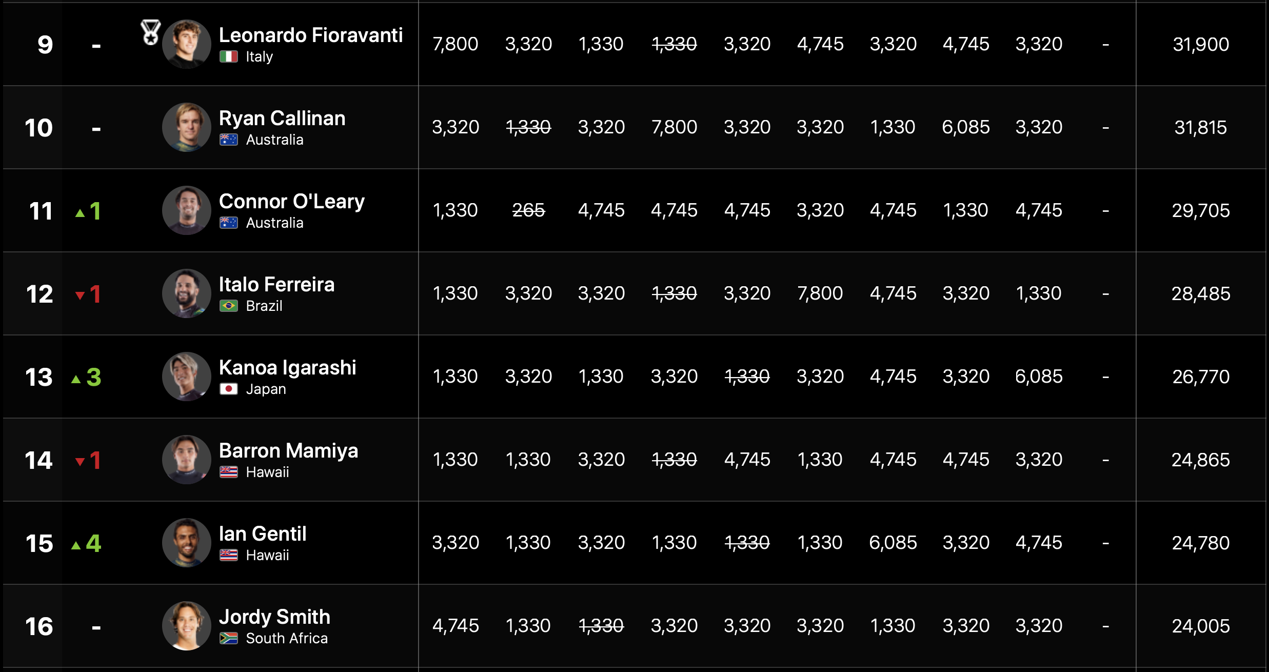 五十嵐カノアは13位へと順位を上げ、COnnor O’learyも11位にランキングアップ。