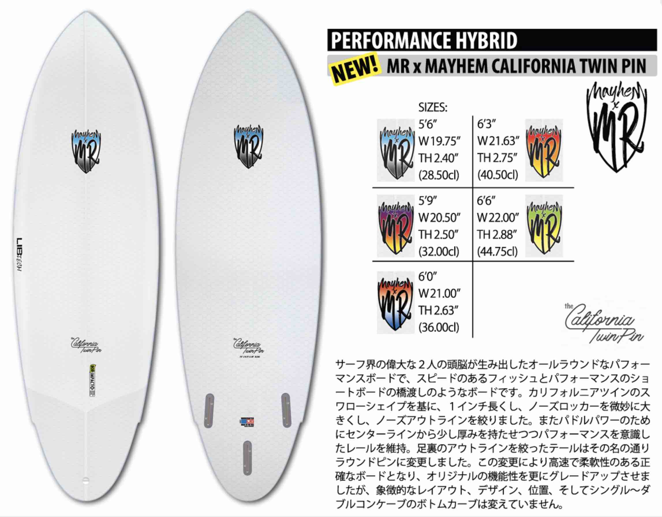 ツインフィンが主流だった1979年から1982年まで4年連続ワールドチャンプに輝いた経歴を持ち、世界一流シェイパーとして現役で活躍するMark Richardsと、言わずと知れた世界指折りのトップシェイパーMAYHEMがコラボを果たして完成を果たした”CALIFORNIA TWIN PIN”モデルが、スノーボードの製造技術を活かした独自の世界最先端マテリアルで世界のサーフシーンに一石を投じるLIBTECH surfboardsよりリリース!