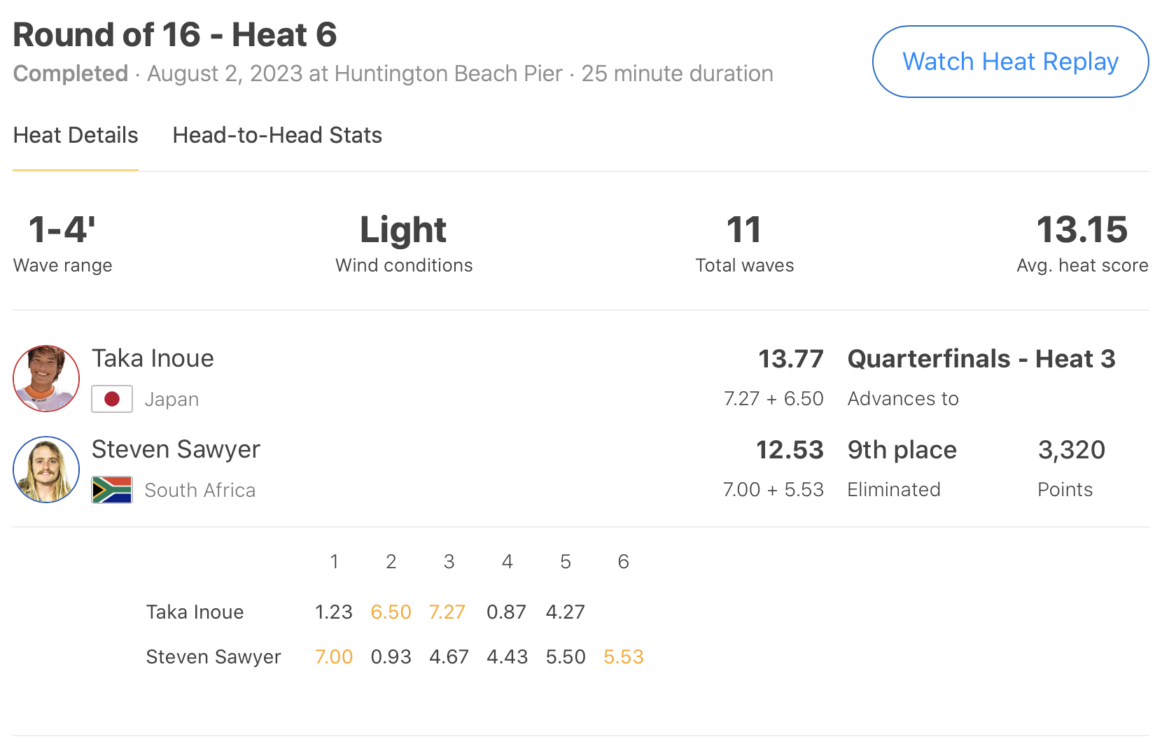 Steven Sawyerが1本目から7.00ptを叩き出してヒートの流れを掴んだかのように思われたが、相対する井上鷹も2本目で6.50pt、3本目では7.27ptとこのヒートのハイエストスコアをマーク!