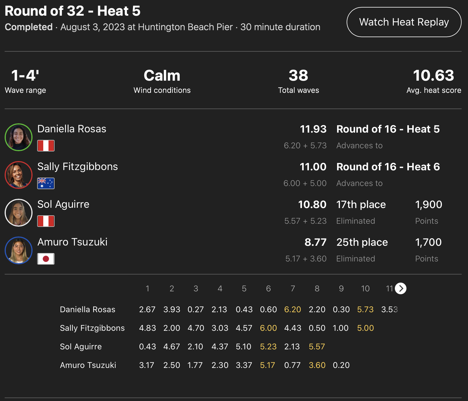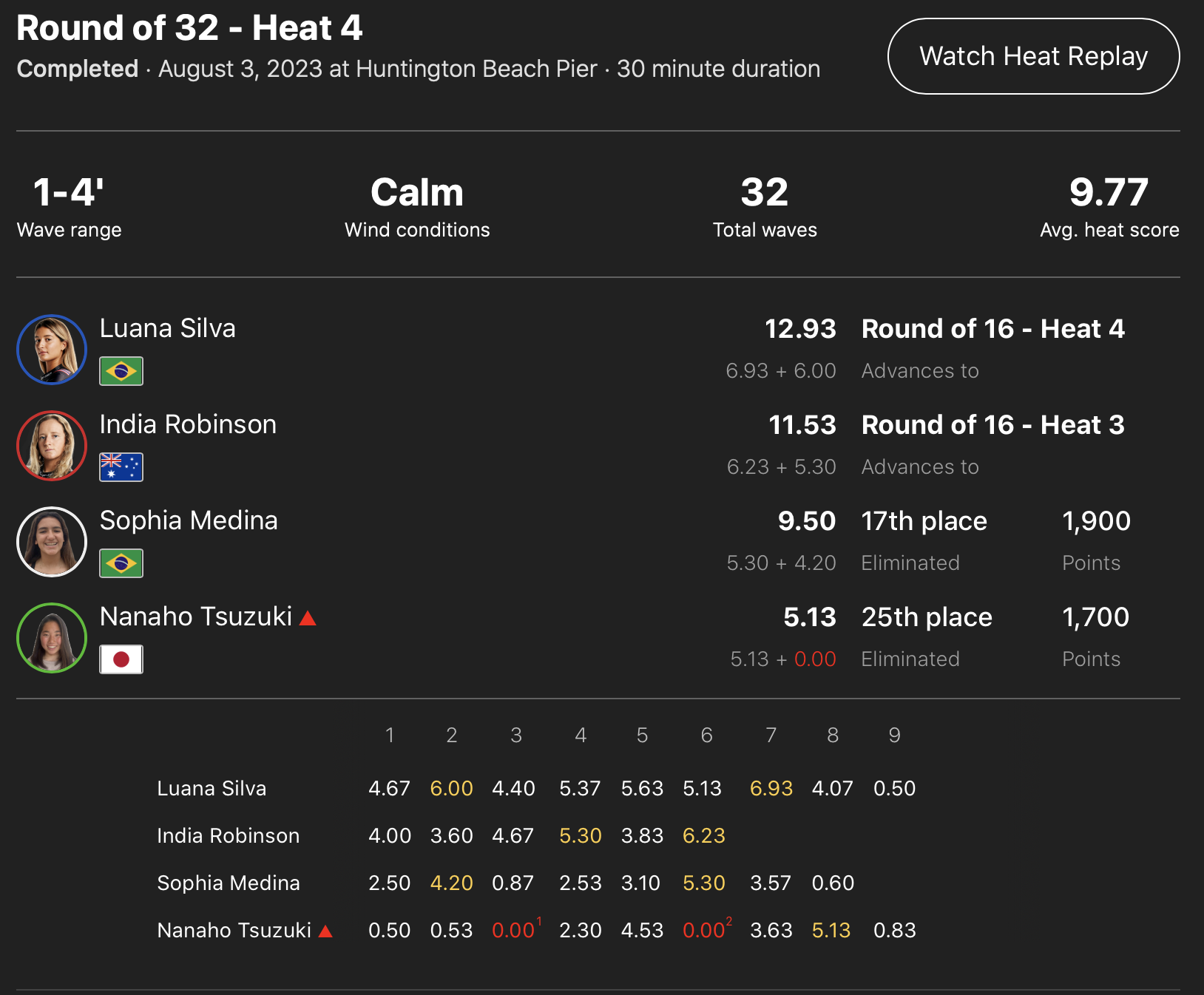 注目の日本人選手たちの活躍は、WOMENSラウンドオブ32のヒート4で痛恨のインターフェアを犯してしまった都築虹帆と、ヒート5に組み込まれていた都筑有夢路の2名が共に惜しくもここで4位で敗退。
