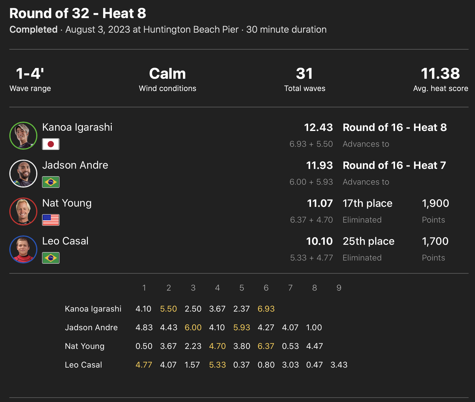 Jadson Andre、Nat YoungといったCTサーファーを相手に1位のポジションでラウンドオブ16へと駒を進めた!