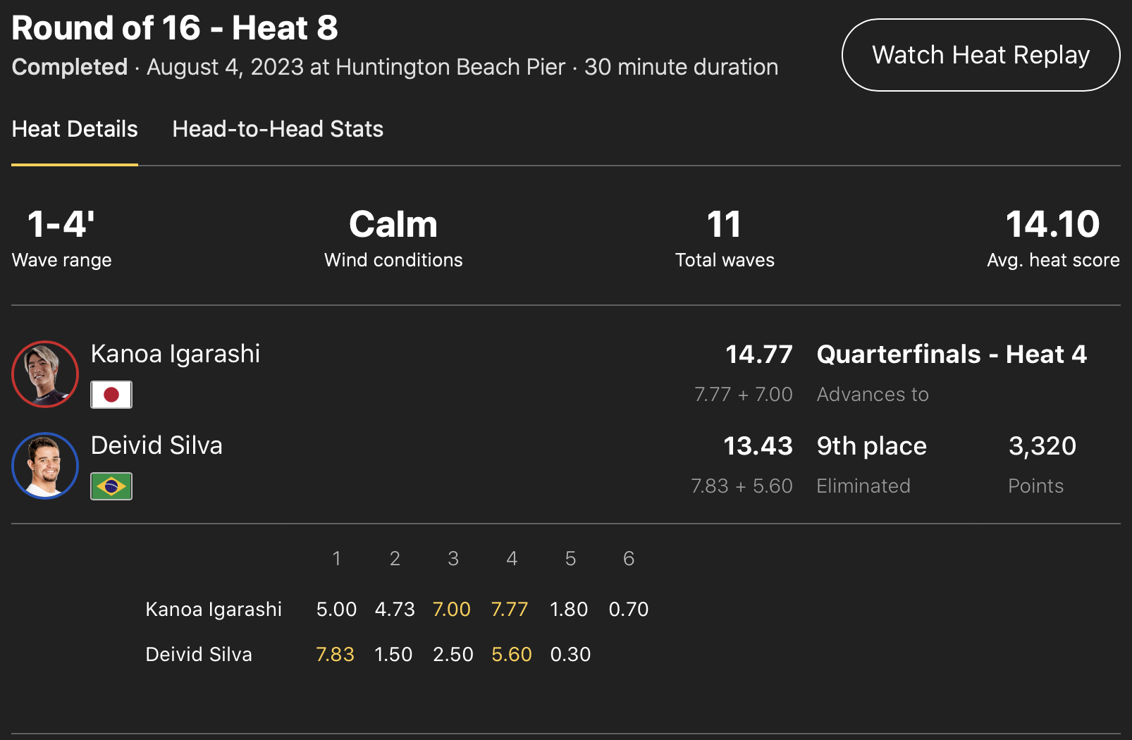 注目の五十嵐カノアはラウンドオブ16のヒート8でDeivid Silvaと対戦。