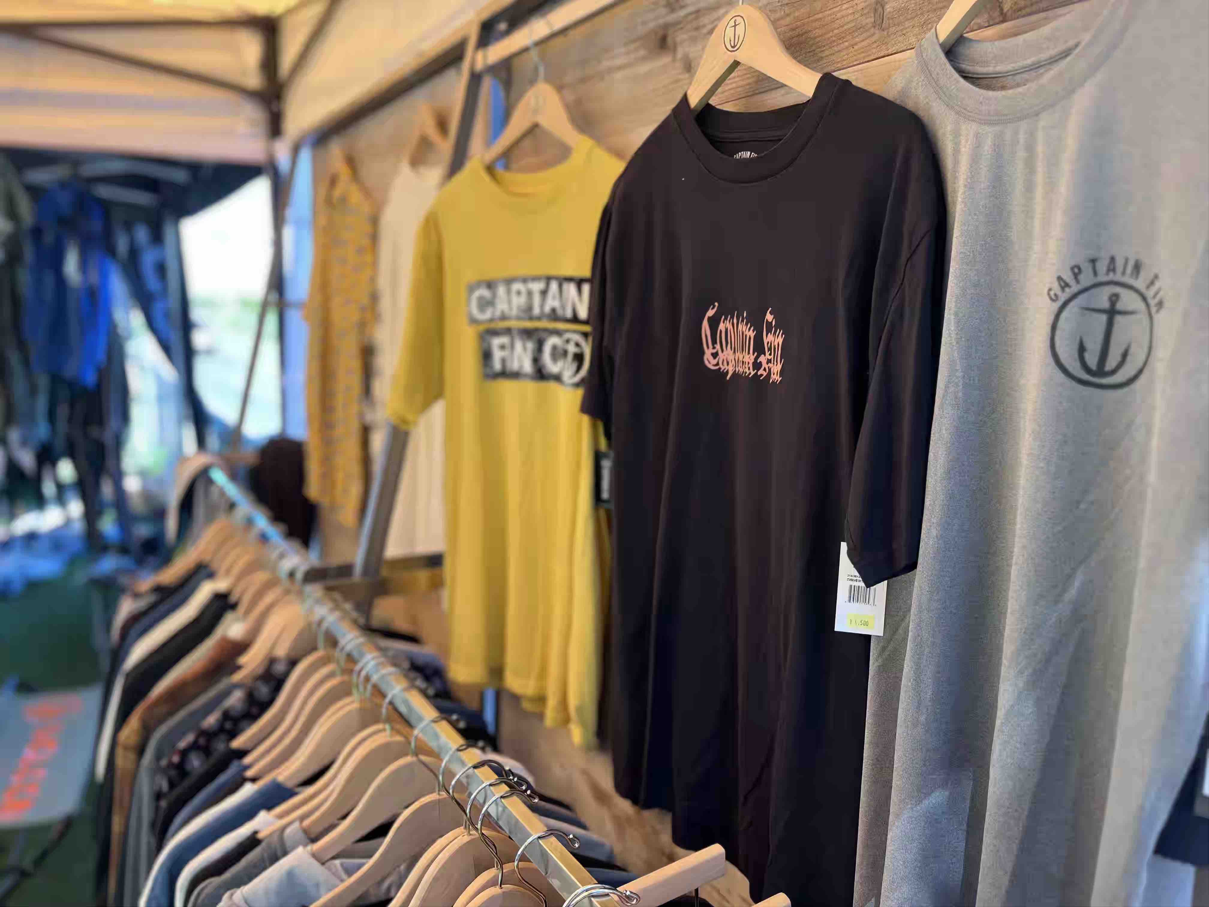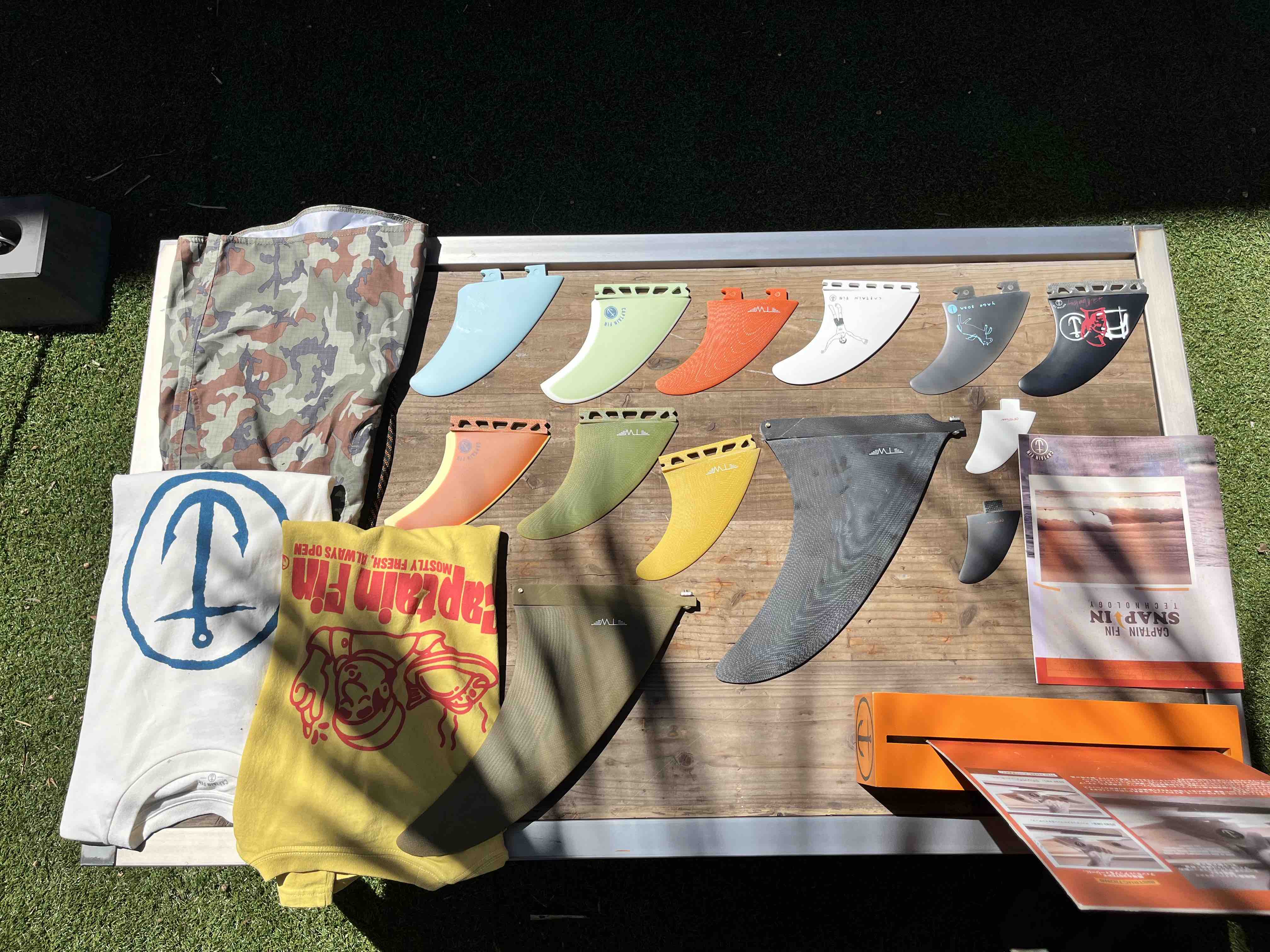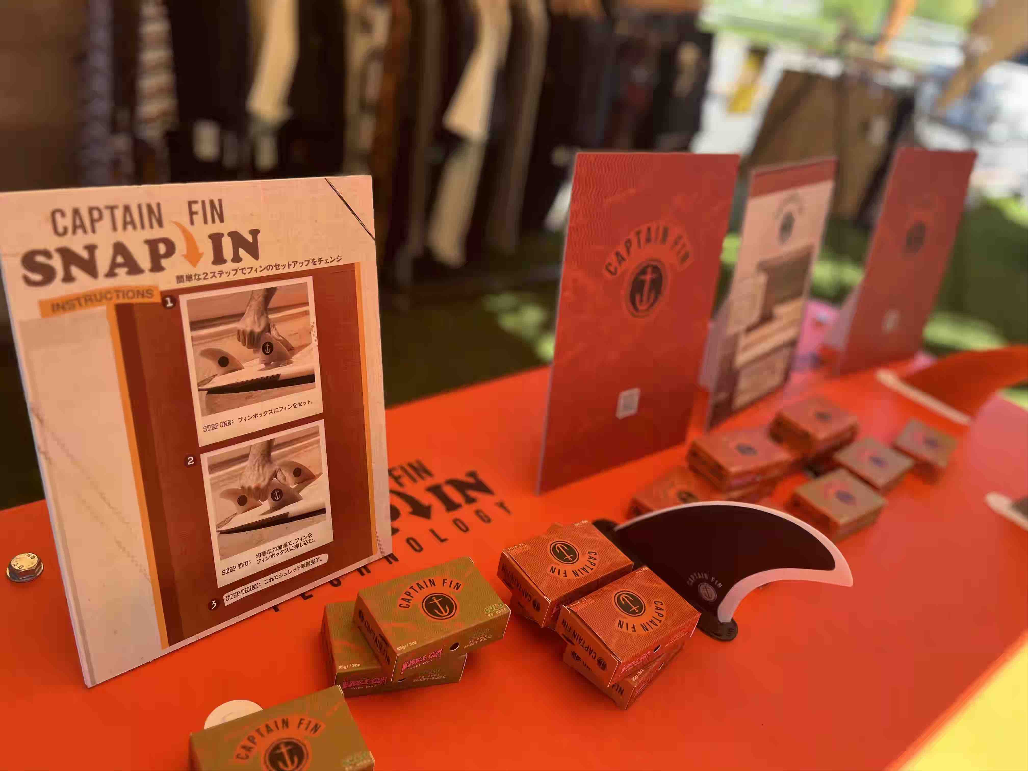 また、Captain FinブースにはCaptain Finが新たに開発して売り出し中の新しいフィンシステム”Snap In”はもちろん、注目のフィンの数々、さらにはデザイン豊富なアパレルも展示された。