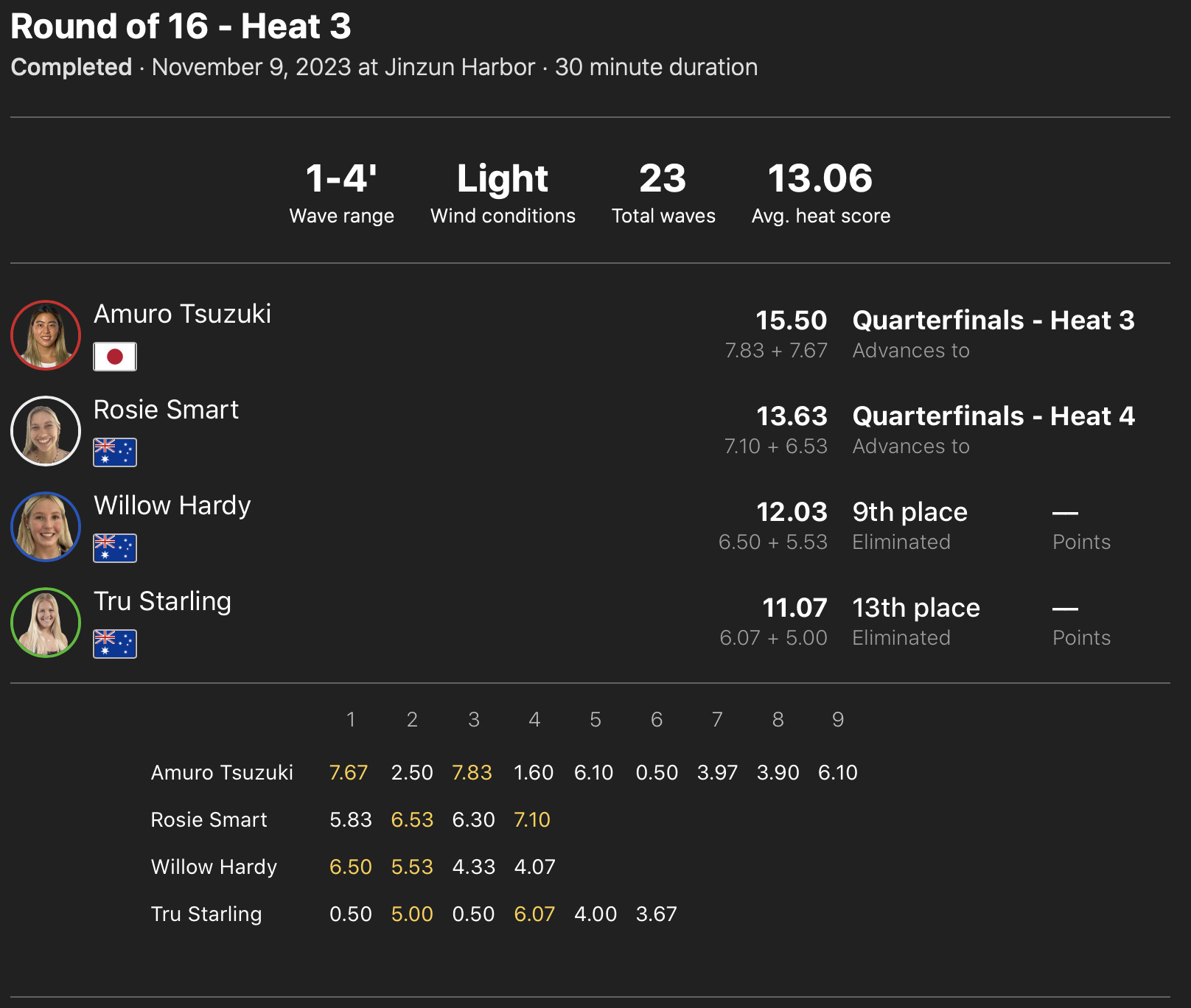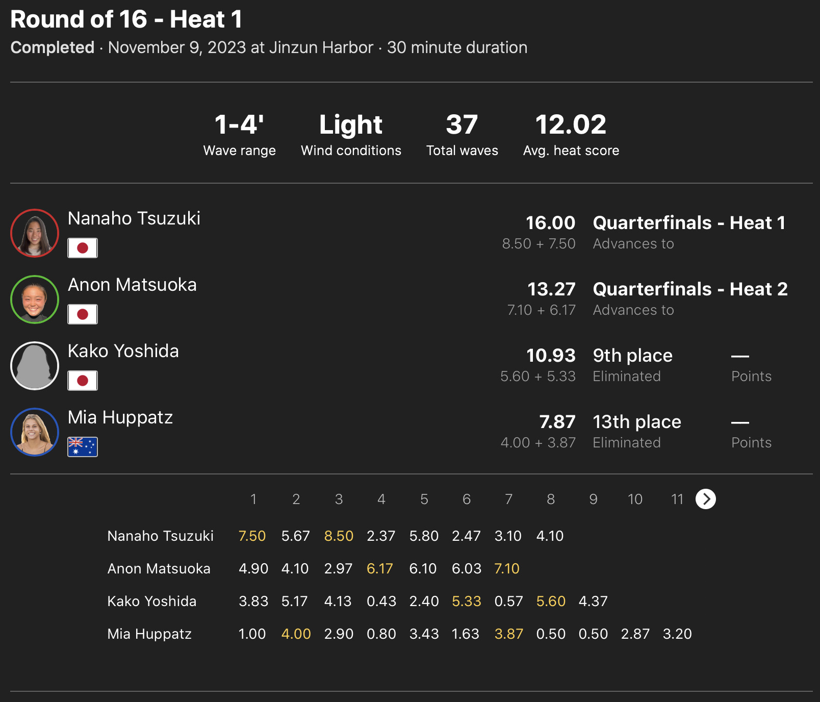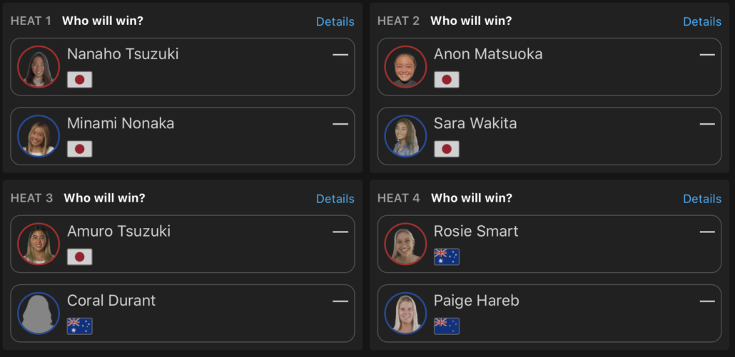 また、MENSラウンドオブ32終了後に行なわれたWOMENSラウンドオブ16のヒート1では都築虹帆が1位で、松岡亜音が2位で、ヒート2では脇田紗良が1位で、野中美波が2位で、さらにヒート3の都筑有夢路が1位のポジションでクォーターファイナル進出を決めた!!
