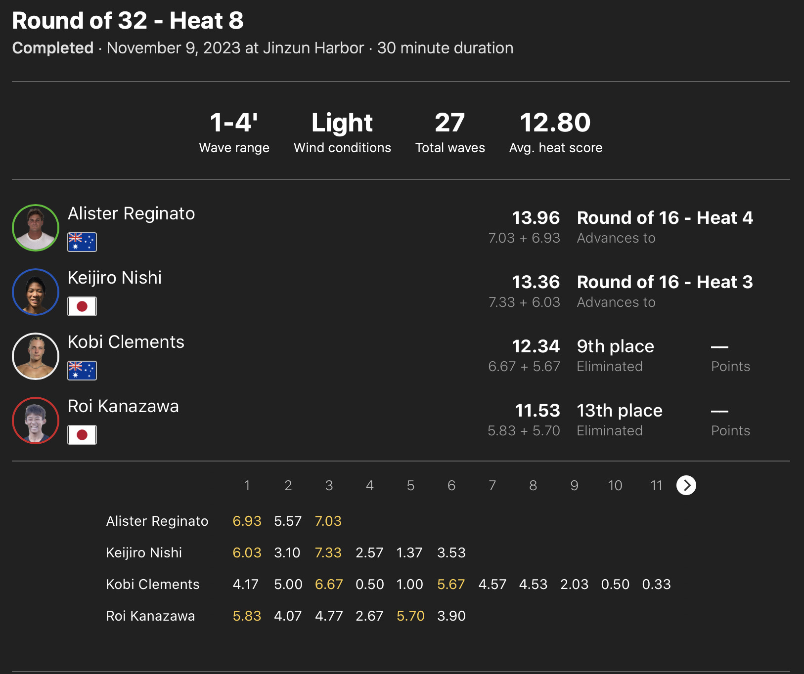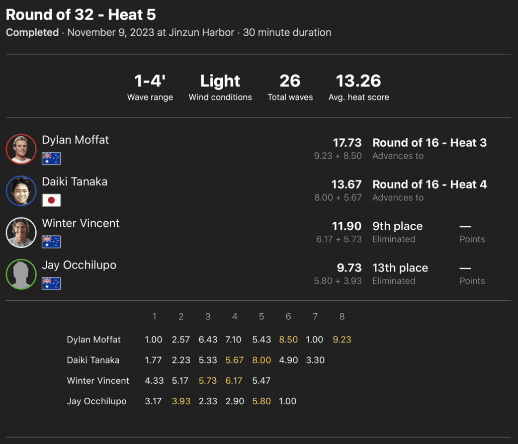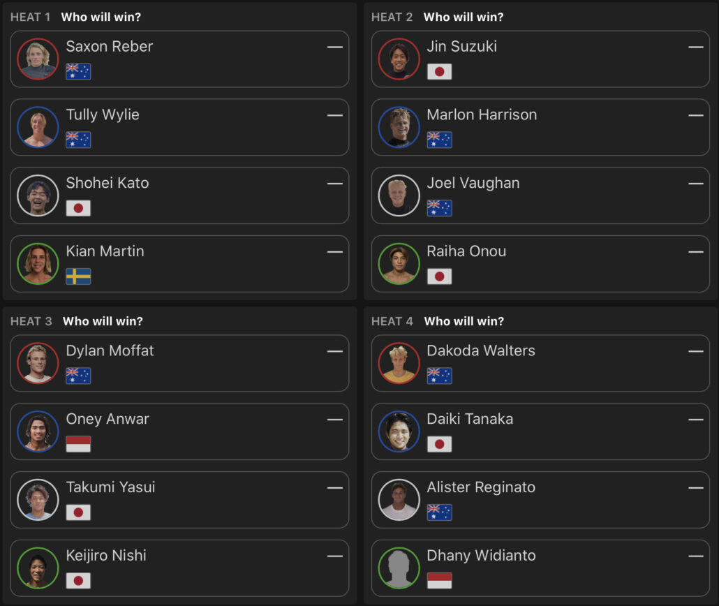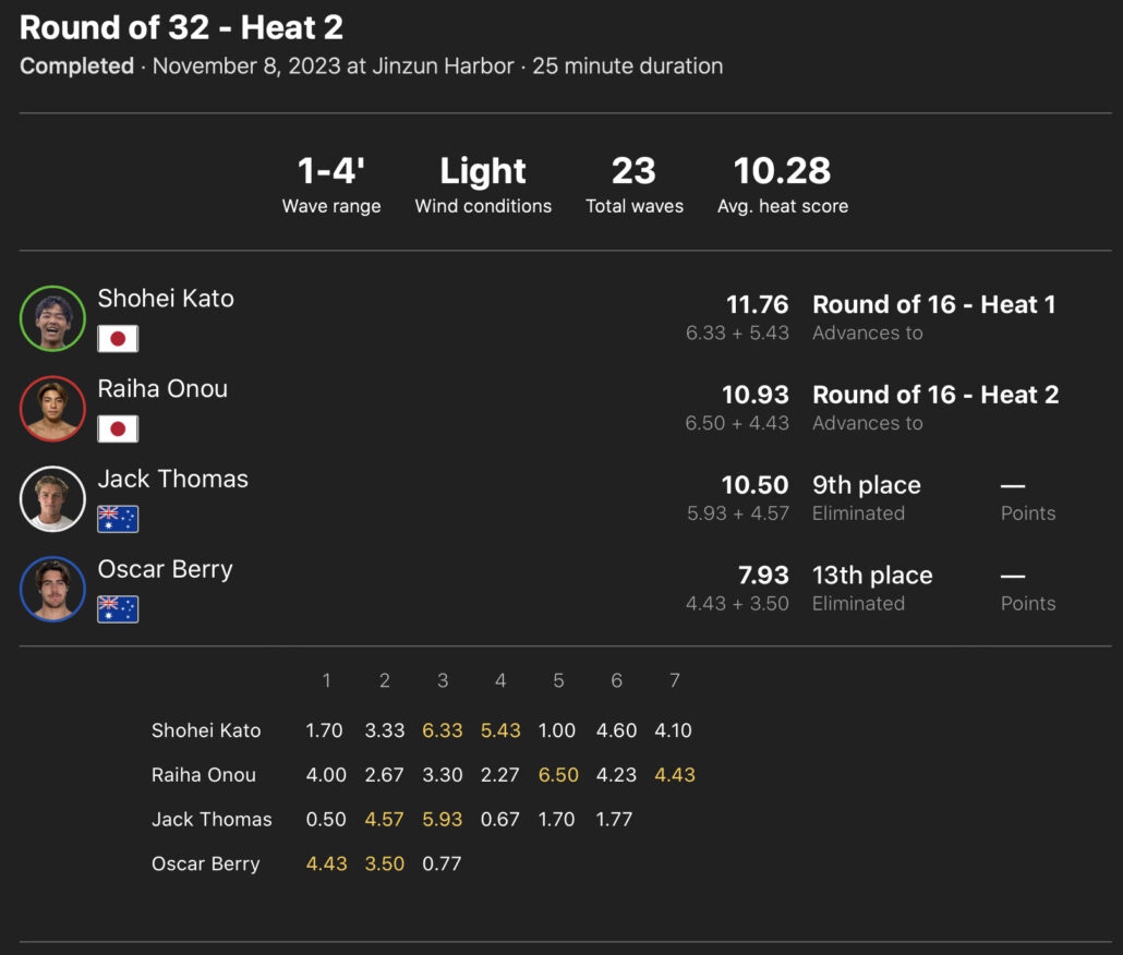 注目の日本人選手たちの活躍は、ラウンドオブ32のヒート5に出場の田中大貴が2位で、ヒート6の安井拓海が1位で、ヒート8の西慶司郎が2位でラウンドオブ16へ進出!