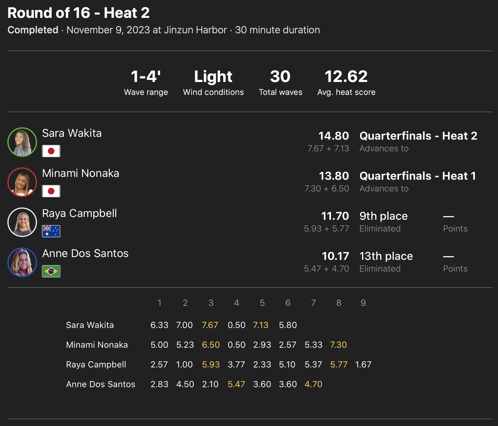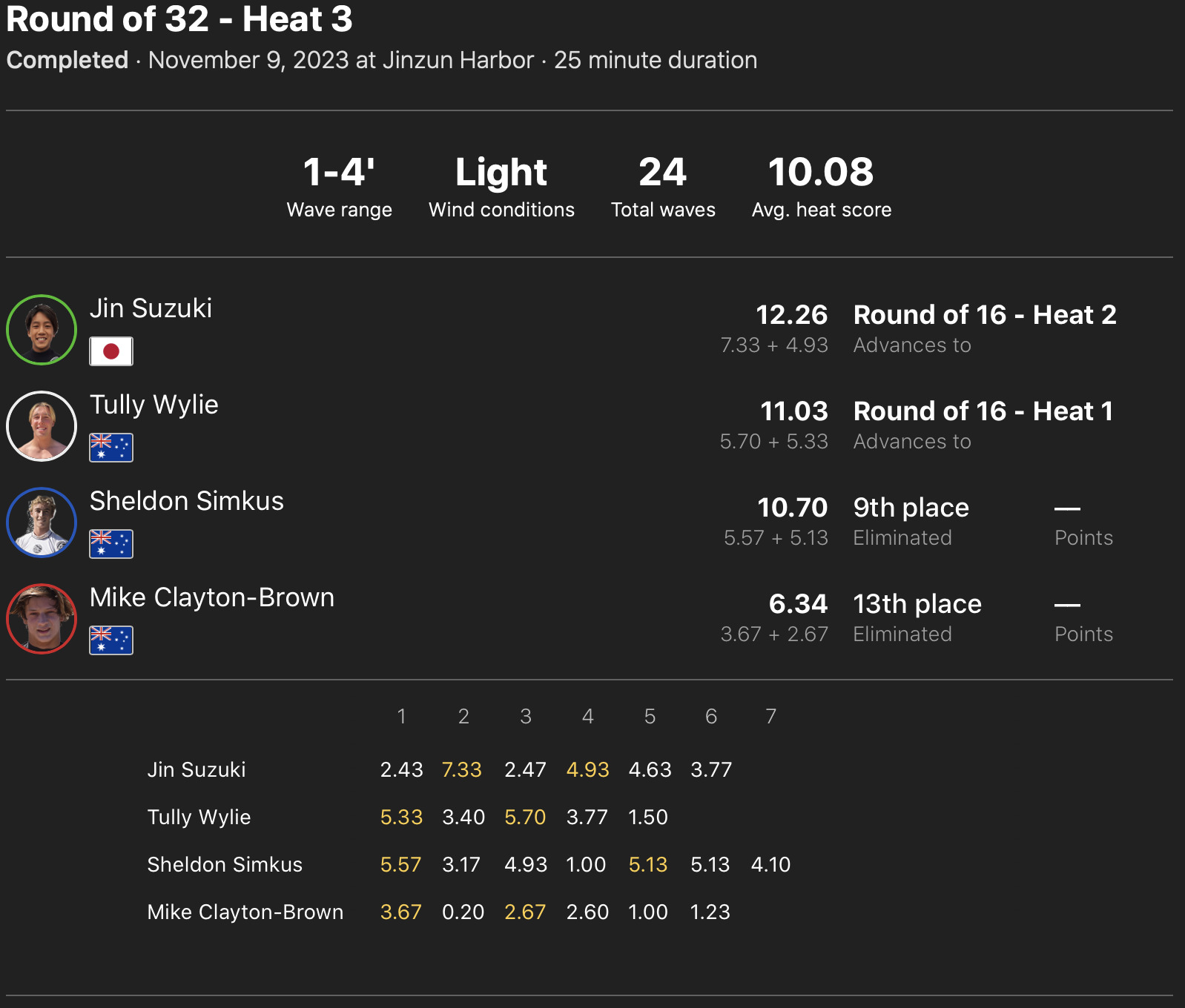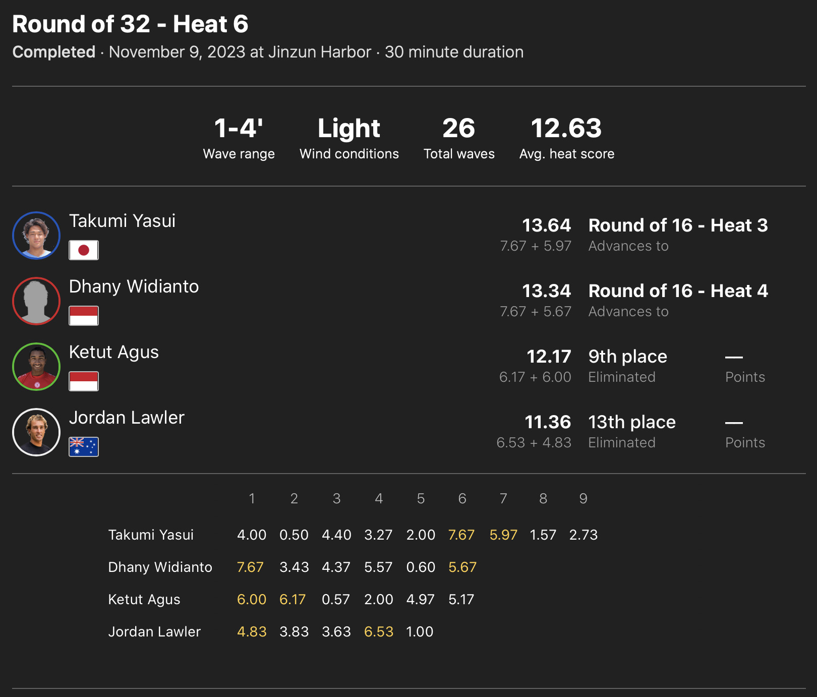 注目の日本人選手たちの活躍は、ラウンドオブ32のヒート5に出場の田中大貴が2位で、ヒート6の安井拓海が1位で、ヒート8の西慶司郎が2位でラウンドオブ16へ進出!