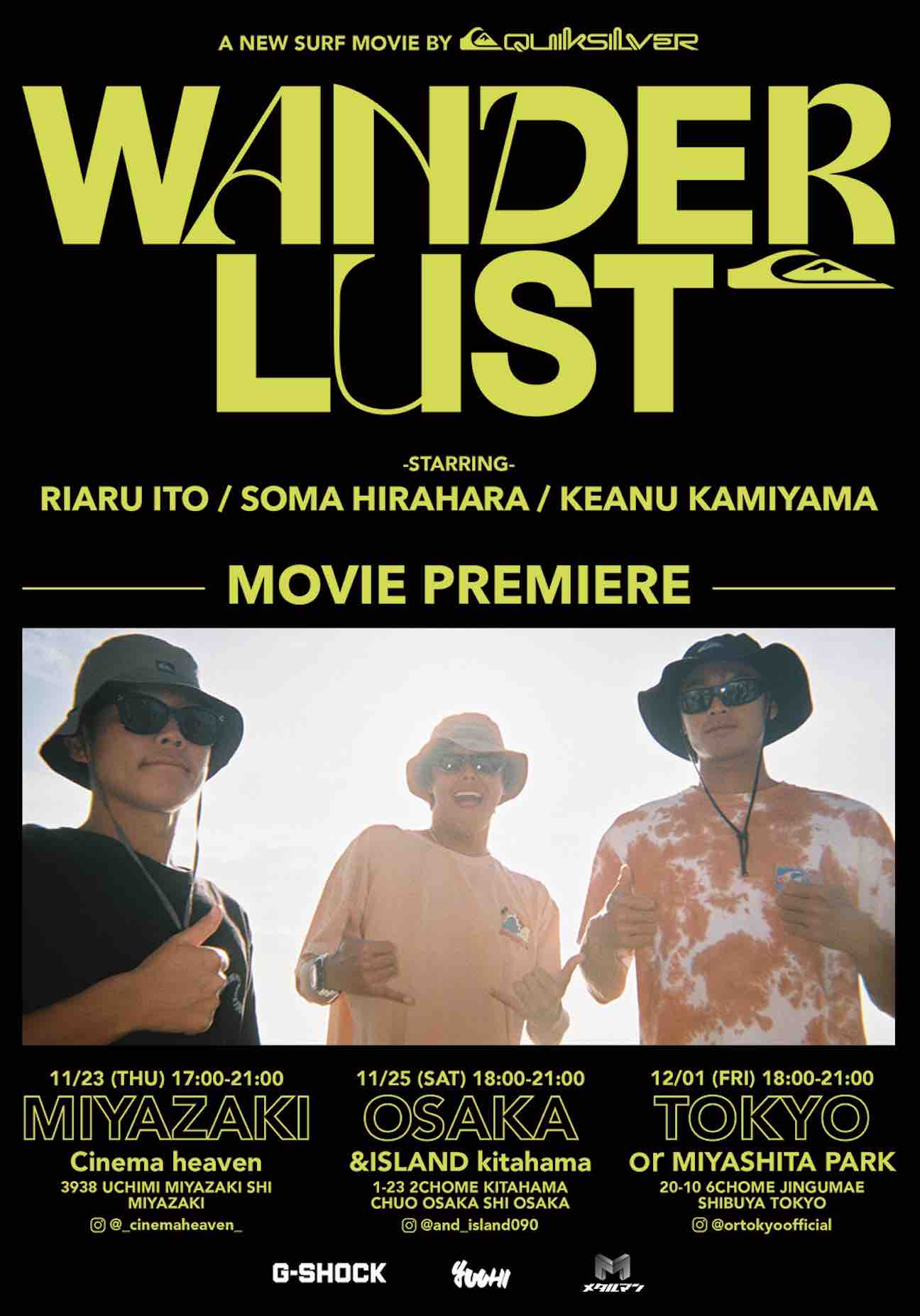そんな現代の日本のサーフシーンを引率する若きサーフスター3名によるインドネシア・サーフトリップをフィーチャーしたプレミアム・サーフムービー”WANDERLUST”の上映会が宮崎、大阪、東京の3箇所で開催されることが決定!