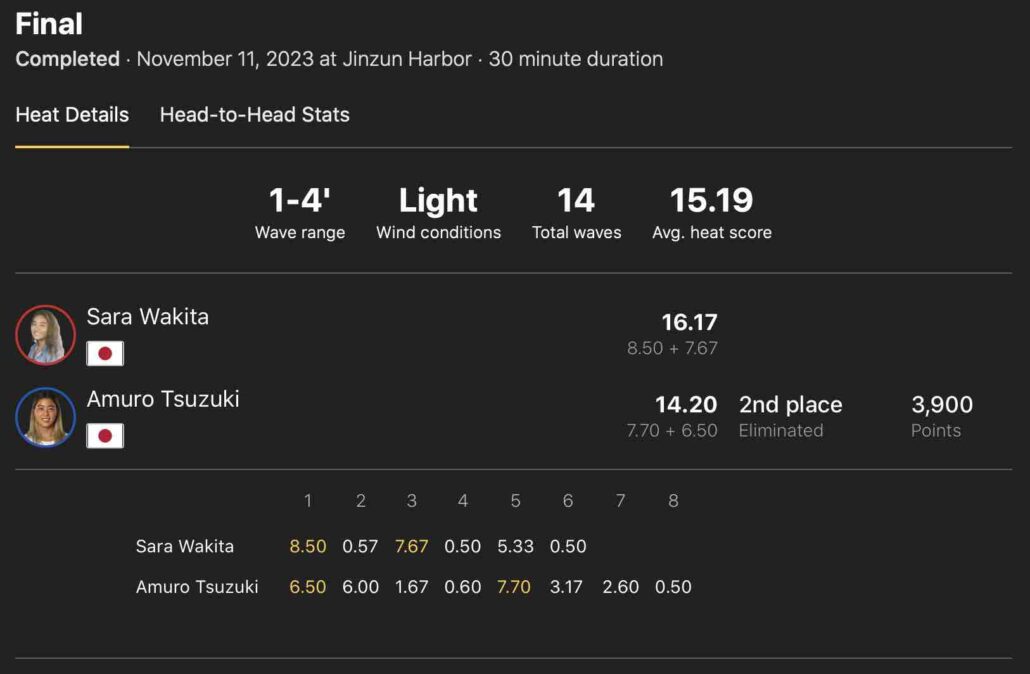 WOMENSではセミファイナルのヒート1で脇田紗良に終盤に大逆転されてしまった都築虹帆が3位入賞!
