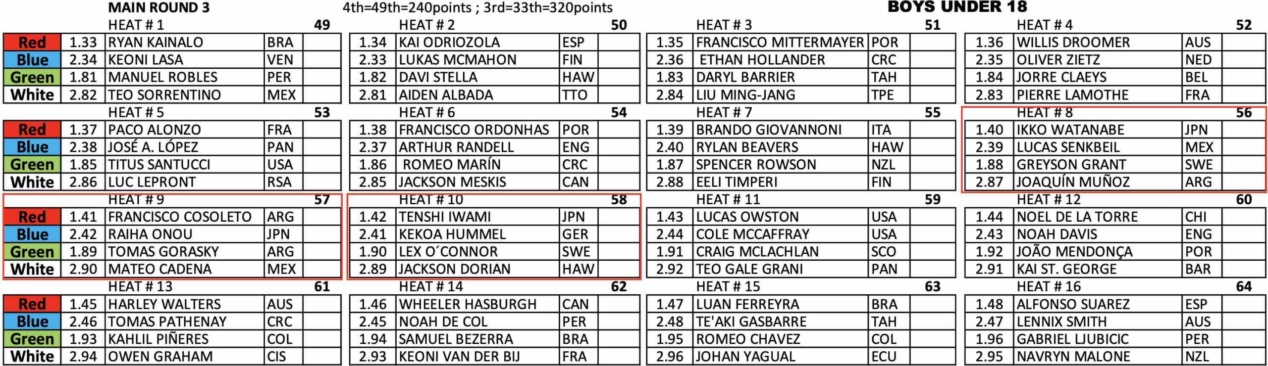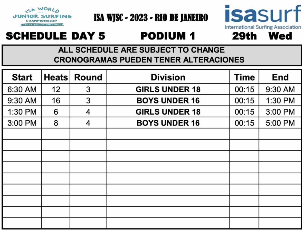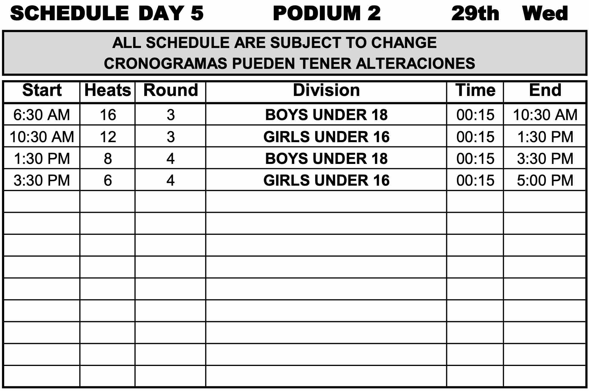 コンテストDAY5のポディウム1とポディウム2でのスケジュールと、各クラスのメインラウンド3のヒート表は下記の通り。