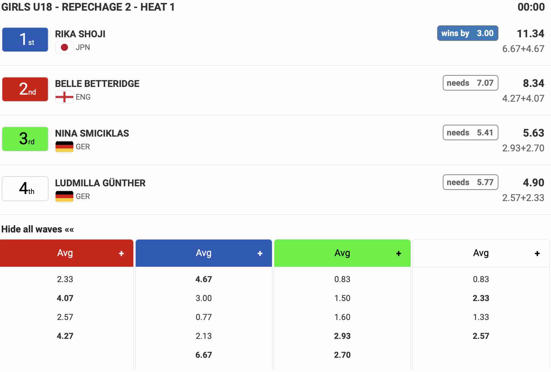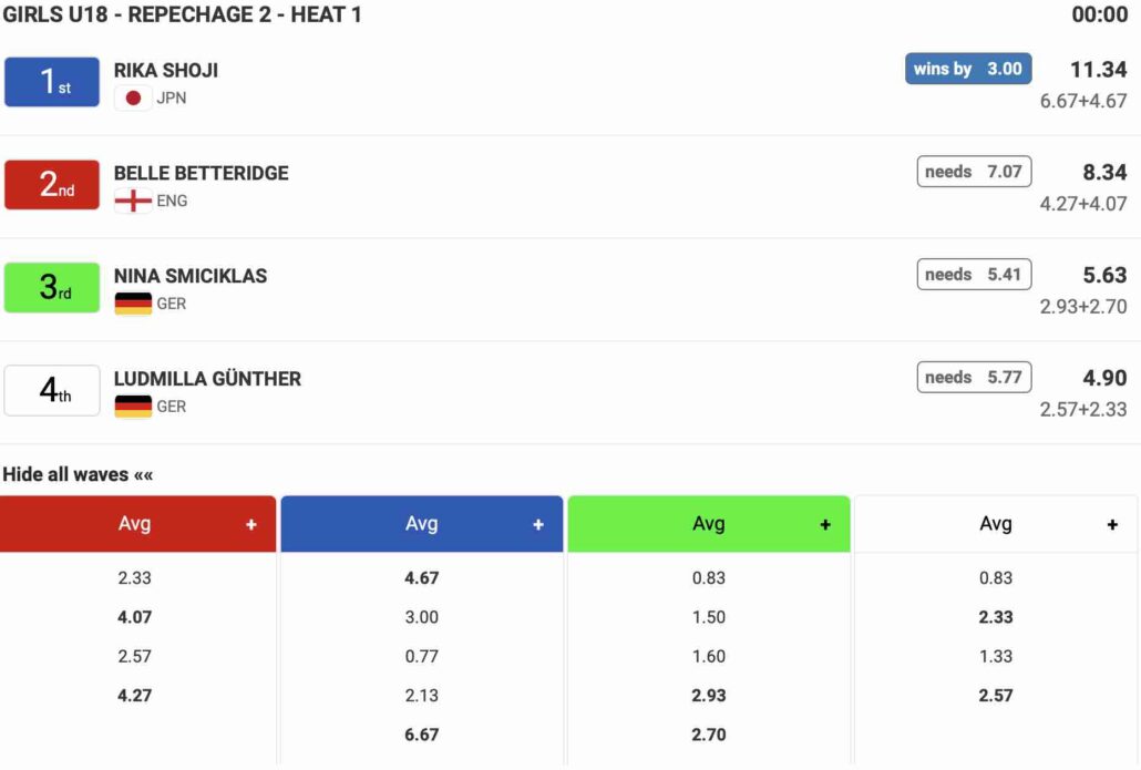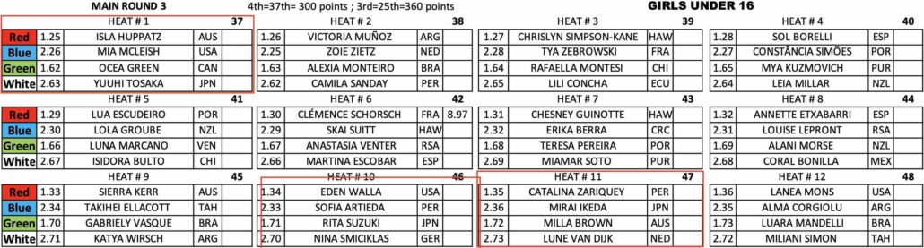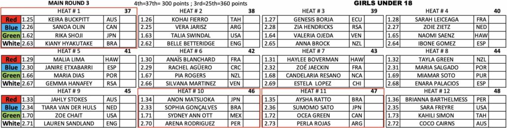 18歳以下女子のGirls U-18のヒート1では1本目の波で4.67ptをまとめ、5本目に掴んだ波で6.67ptのハイスコアをマークした庄司莉花が2位以下の選手たちに3.00pt差をつけて見事ラウンドアップ!