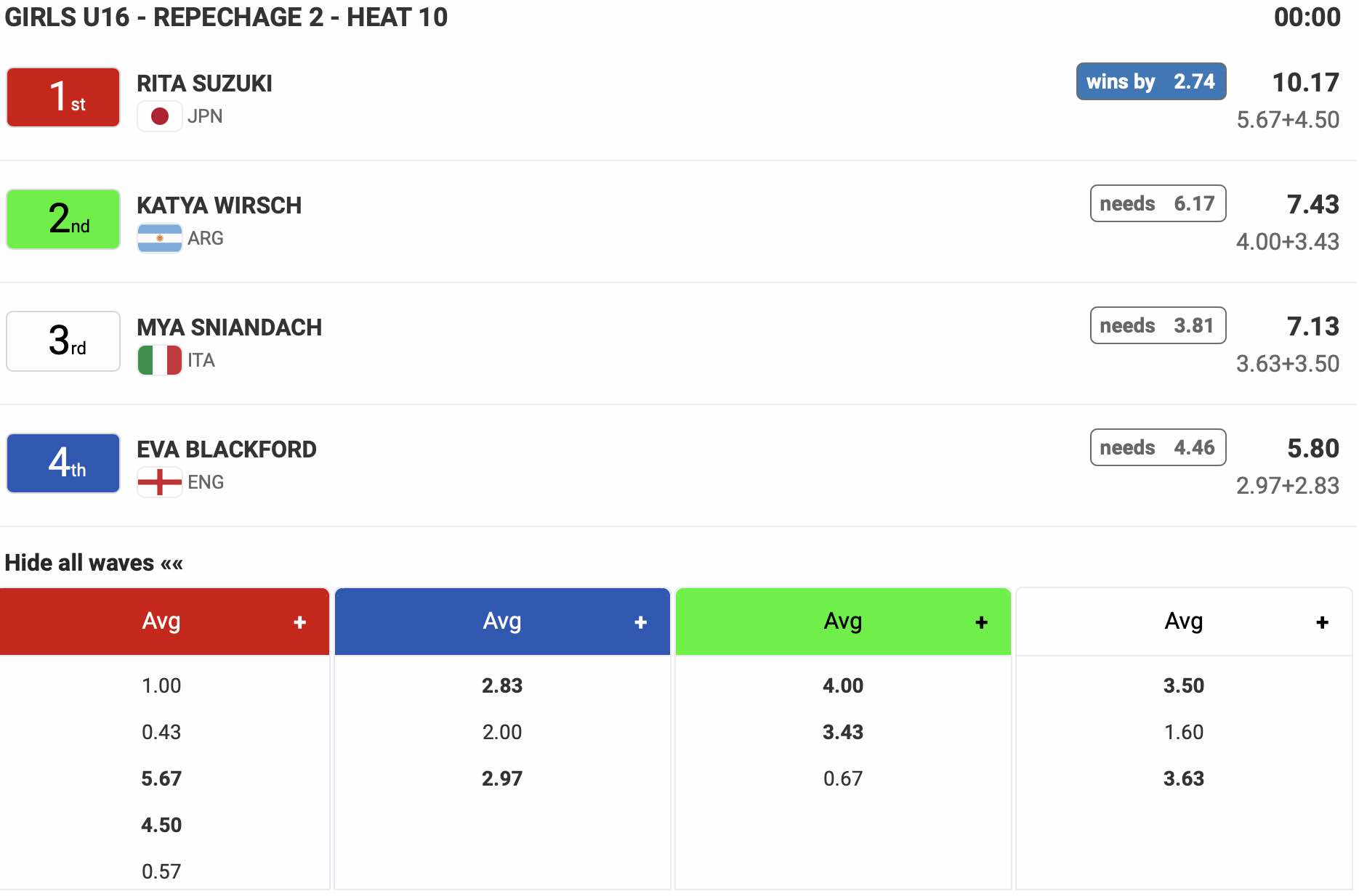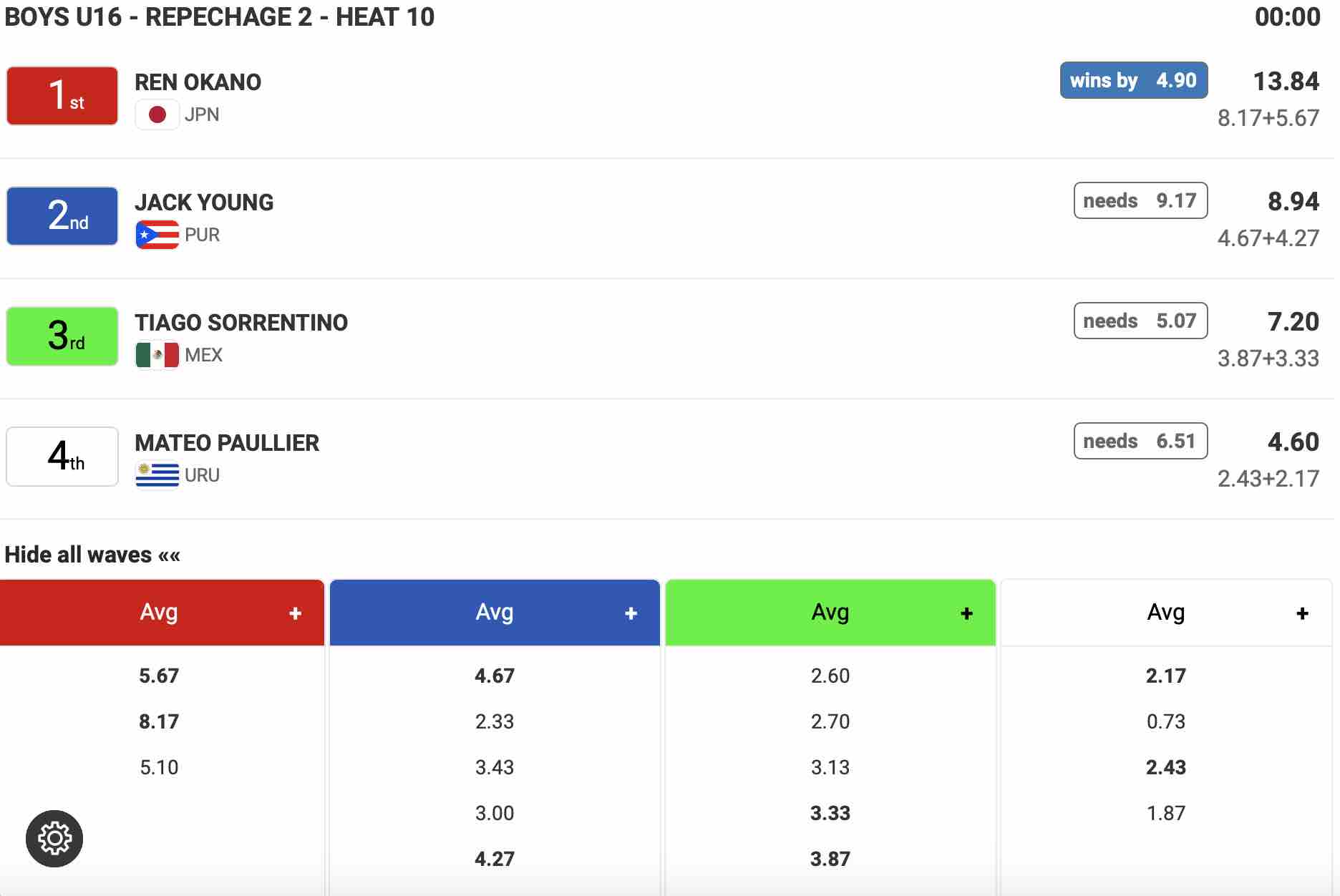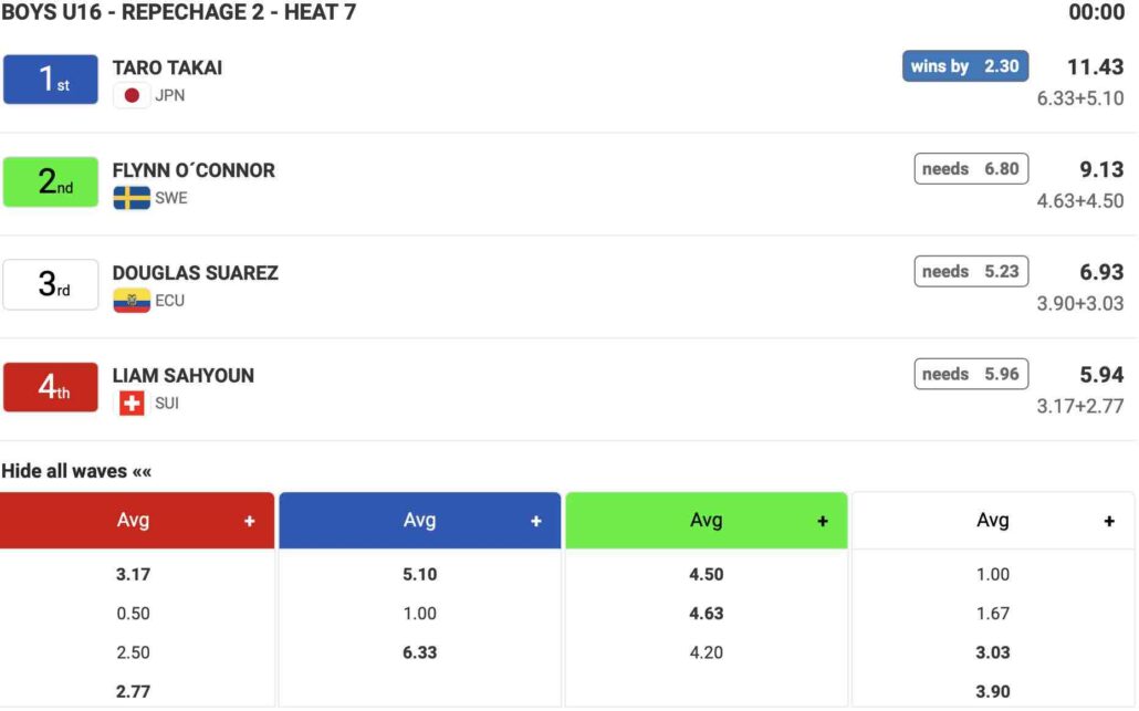さらに16歳以下男子Boys U-16のヒート7では高井汰朗が6.33ptのグッドスコアに5.11ptのバックアップをまとめて1位でラウンドアップを決め、その勢いをバトンタッチで受け取ったかのごとく、ヒート10に登場となった岡野漣が2本目の波で8.17ptのエクセレントスコアを叩き出し、他の選手たちに4.90pt差という大差でメインラウンド3へと駒を進めた!!