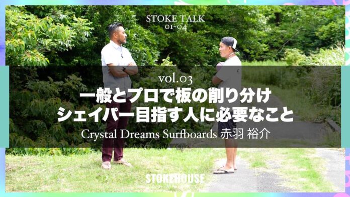 今回の作品は、ジャンルやスタイルにこだわらず、サーフィンやカルチャーのあれこれについてトークしていく当チャンネルの新シリーズ”STOKE TALK(ストークトーク)”第3弾となっており、VISSLAジャパンの広告塔で、言わずと知れたカリスマ・プロサーファーである市東重明と、同じくVISSLAジャパンチームを代表するクリエイターでCrystalDream surfboardsのシェイパー赤羽裕介によるスペシャル対談を収録。