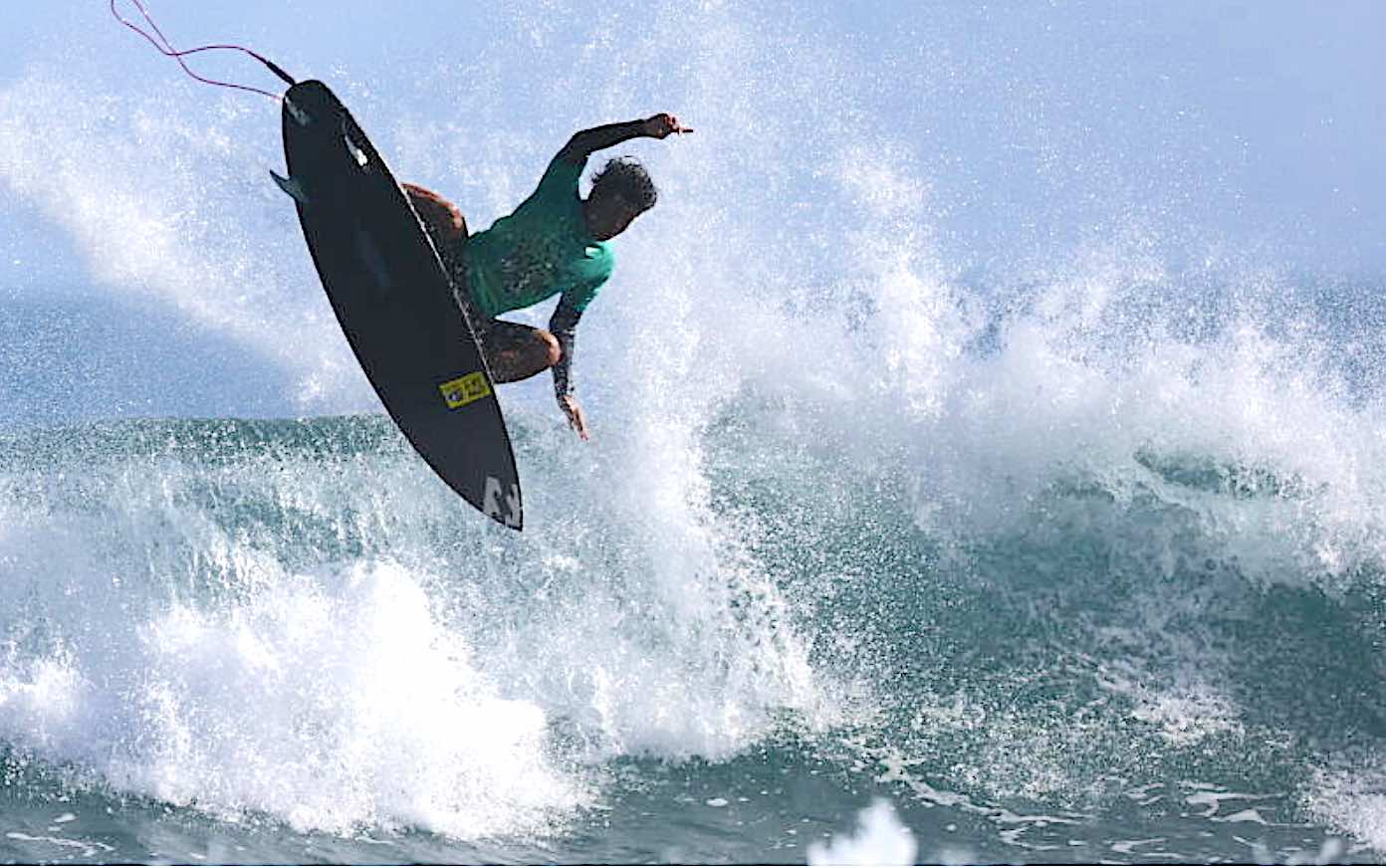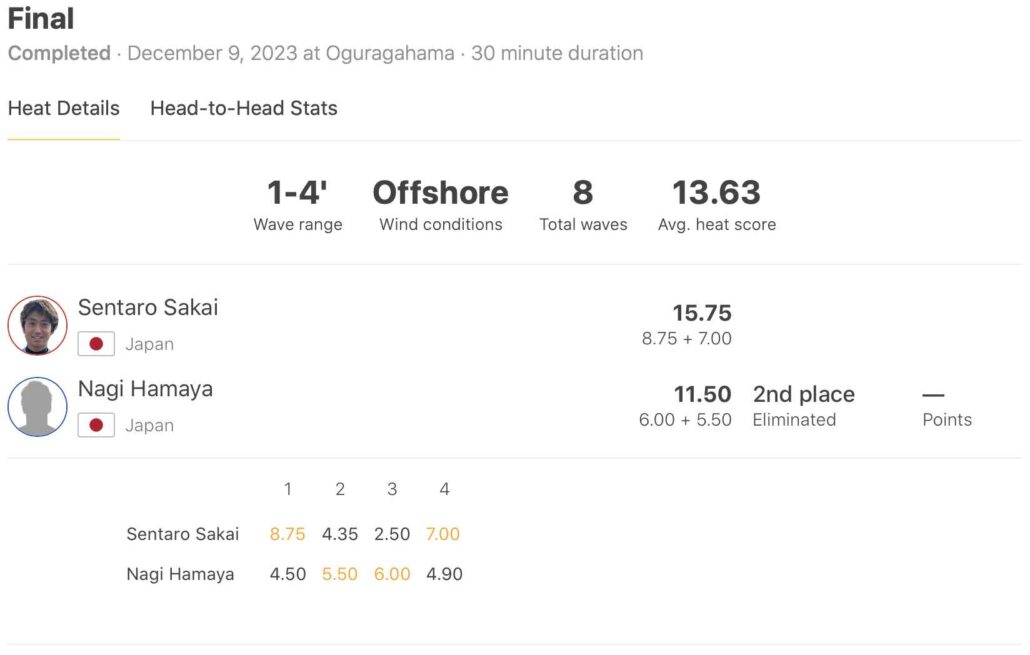 ヒート開始早々、両選手共に波を掴む白熱した展開でスタートを切った中、酒井仙太郎がこの1本目のバックサイドで8.75ptのエクセレントスコアを叩き出す!