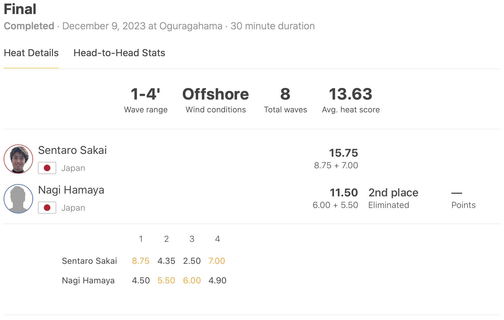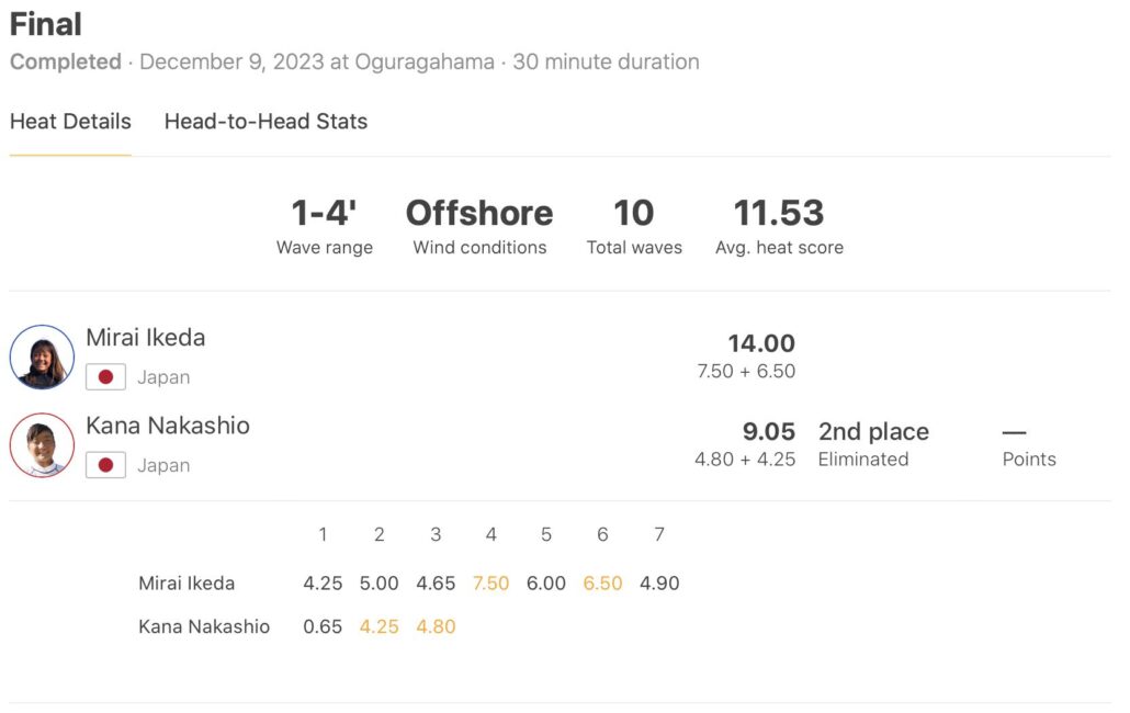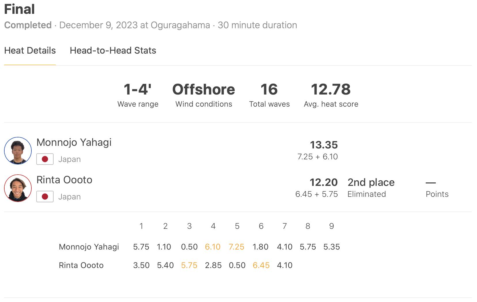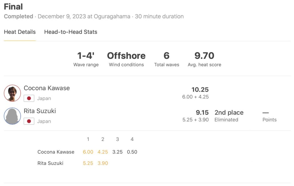両者共に優勝できる可能性を秘めているだけに勝負の行方が見えない試合展開が予想されたが、川瀬心那が1本目に掴んだ波で6.00ptのグッドスコアをマーク。