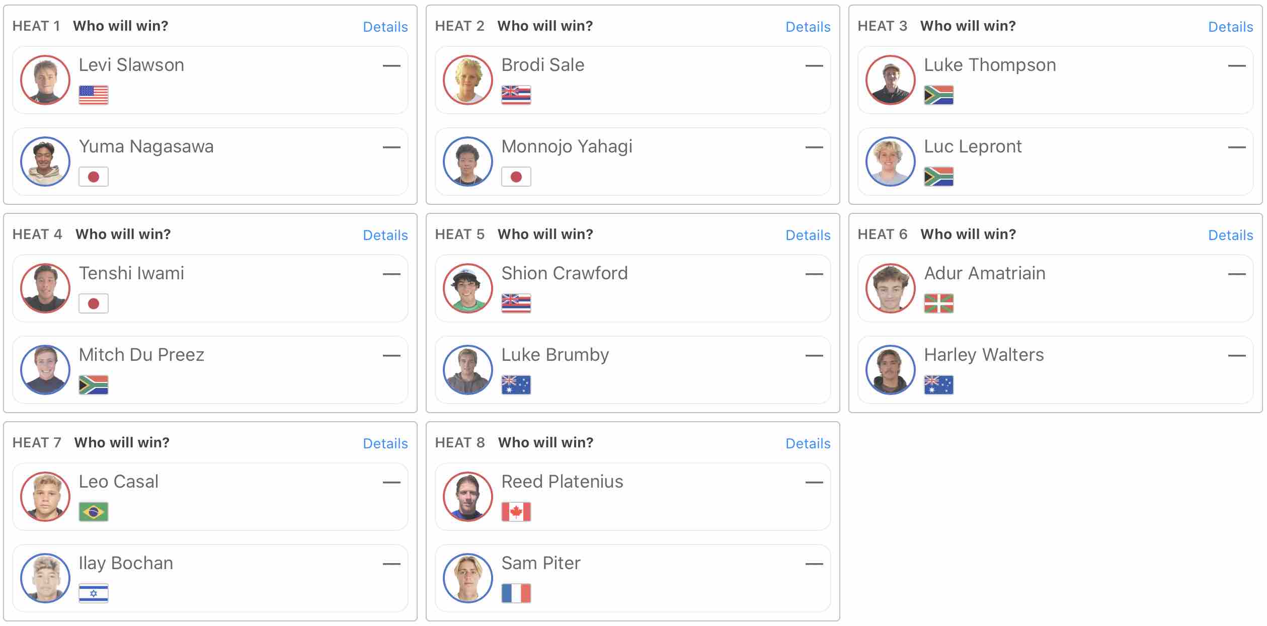 注目の日本人選手たちの活躍は、MENSラウンド1のヒート1の岩見天獅とヒート4の長澤侑馬が2位、ヒート5の矢作紋乃丞が3位、WOMENSラウンド1のヒート3の川瀬心那が3位、ヒート6の中塩佳那とヒート8の都築虹帆が2位となり、敗者復活戦となるイリミネーション・ラウンドへと進出。