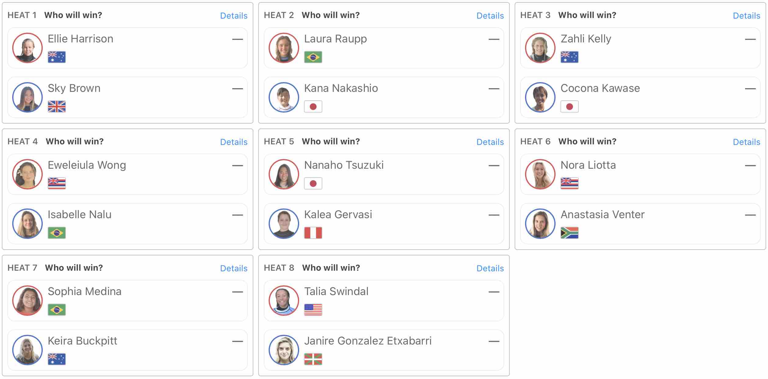 WOMENSイリミネーション・ラウンドではヒート2で中塩佳那がLaura Raupp、ヒート3で川瀬心那がZahli Kelly、ヒート5で都築虹帆がKakea Gervasiと対戦予定となっている。