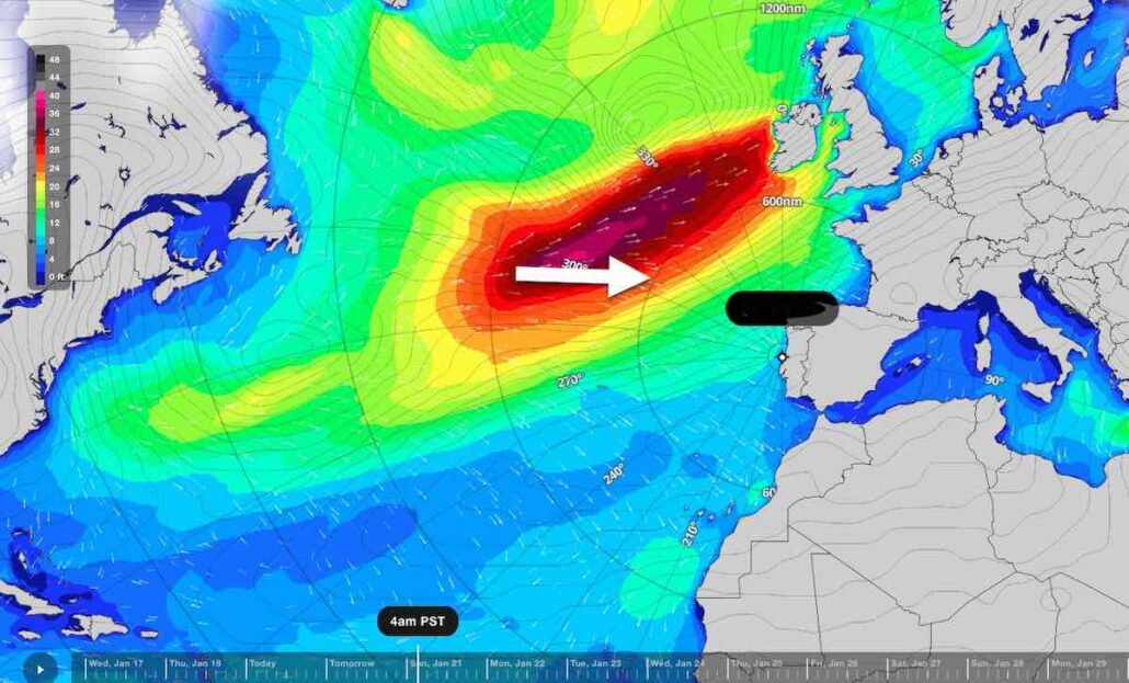 1/22(月)の朝は比較的ゆっくりとサイズアップしていき、メインとなるスウェルはお昼から夕方にかけて35ftから45ftに到達、最大セットで50ftになる可能性があると予想されます。