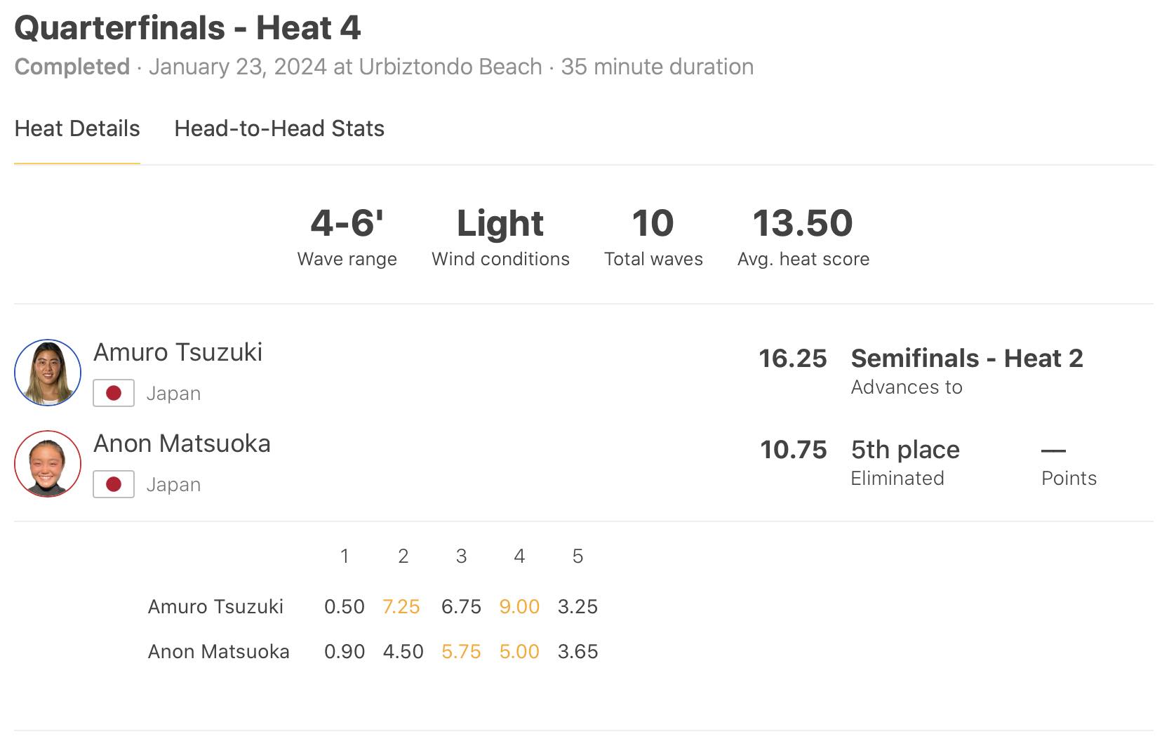 クォーターファイナルのヒート4では、ヒート序盤に7.25ptをマークした後、パワフルなリッピングからそのままフルスピードでリスキーなクローズアウトセクションにクリティカルヒットするパワフルなレイバック・リエントリーの2ターンで9.00ptをマークした都筑有夢路。今大会最高シングルスコアと今大会WOMENS最高トータルスコアとなる16.25ptを記録し、東京オリンピック銅メダリストで元CTサーファーとしての実力の差を見せつけた。