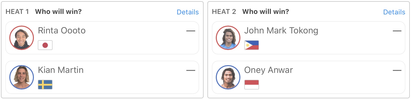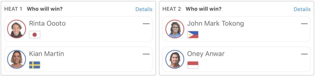 また、MENSでヒート1で大音凛太がKian Martinと、ヒート2ではJohn Mark TokongとOney Anwerが対戦する。