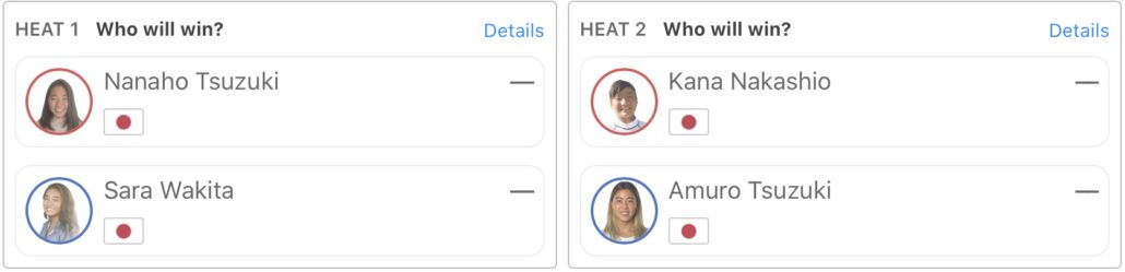 WOMENSではヒート1に都築虹帆と脇田紗良が、ヒート2では中塩佳那と都筑有夢路が対戦する予定となっている。