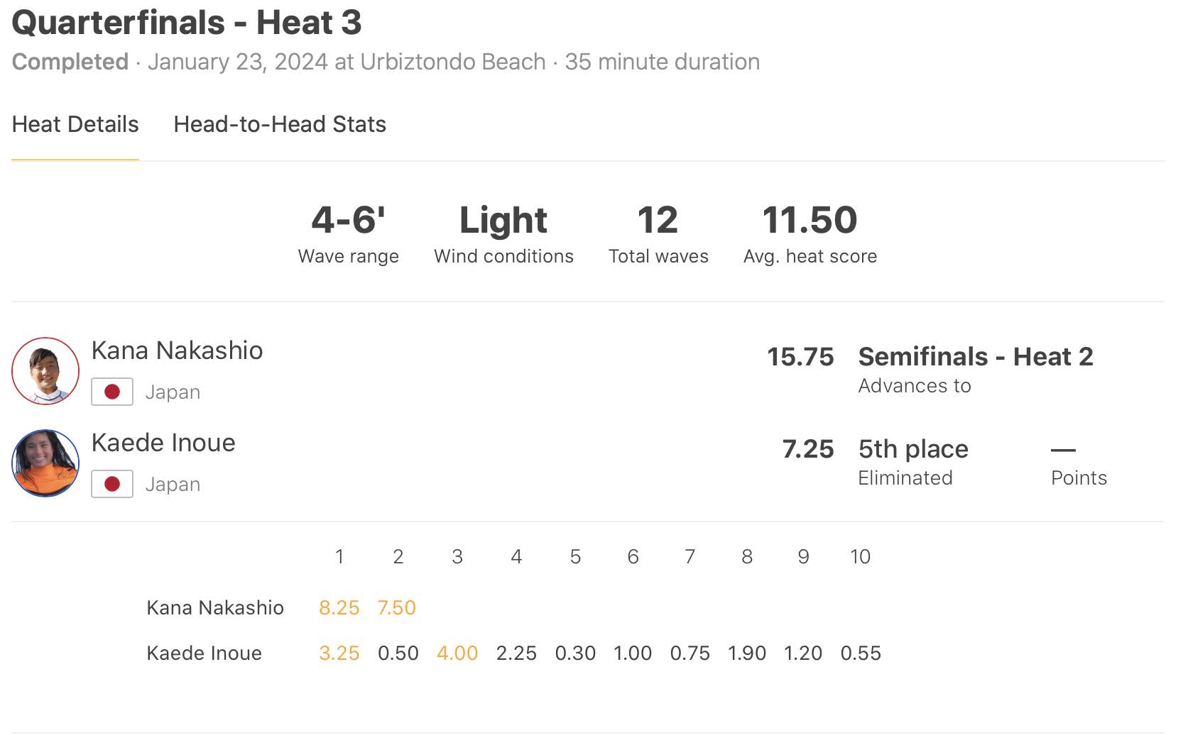 クォーターファイナルのヒート3ではオープニングライドで8.25pt、バックアップに7.50ptを叩き出し、たった2本しか波を掴むことができなかったにも関わらず、セミファイナル進出を決めた中塩佳那。