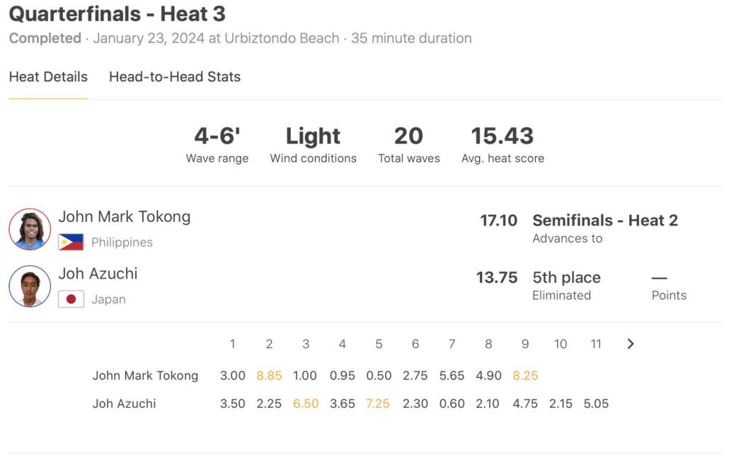 安室丈と対戦したクォーターファイナルのヒート4で8.85ptと8.25ptというエクセレントスコアを2本まとめ、今大会最高トータルスコアとなる17.10ptをマークしたフィリピンのJohn Mark Tokong。
