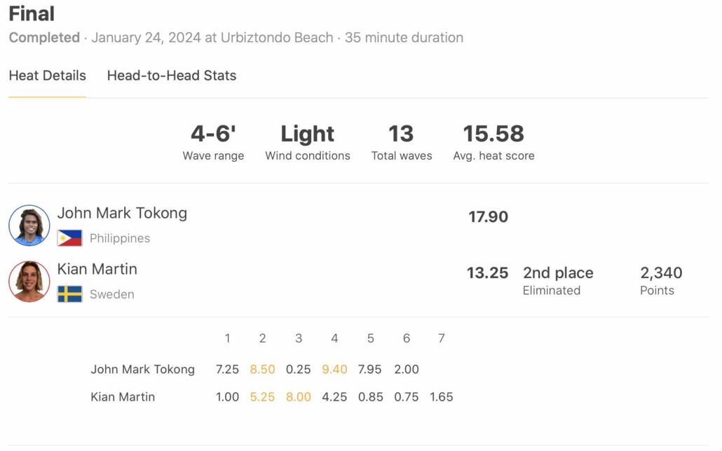 MENS QS3000ではフィリピン出身のJohn Mark TonkongがファイナルでKian Martinを相手に9.40ptといった今大会におけるハイエスト・シングルスコアをマークし、さらにバックアップに8.50ptと2本のエクセレントをまとめてトータルスコアにおいても今大会最高得点となる17.90ptを叩き出し、ぶっちぎりのサーフィンで優勝を勝ち獲り、自国に価値ある一勝をもたらした。