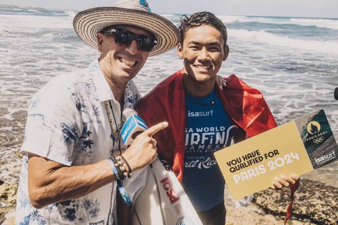 2024年パリオリンピック出場権を賭けた最後のチャンスとなるこの大会もいよいよ終盤を迎えたこの日、インドネシア代表選手で日本人とインドネシア人のハイブリッド・サーファーとして世界で活躍する和井田理央が見事リパチャージラウンド11まで勝ち上がり、2024年パリオリンピック出場権を獲得した!