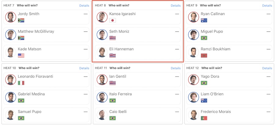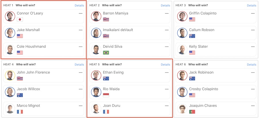 注目の日本人選手はConnor O’learyがヒート1、五十嵐カノアがヒート8に登場!