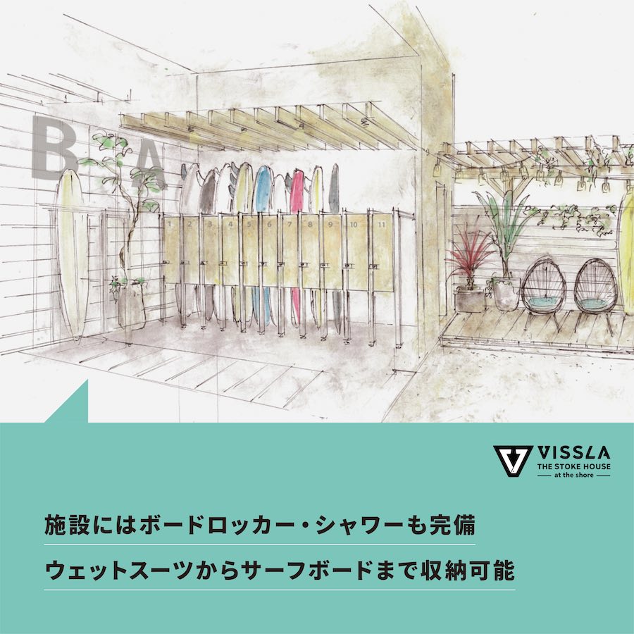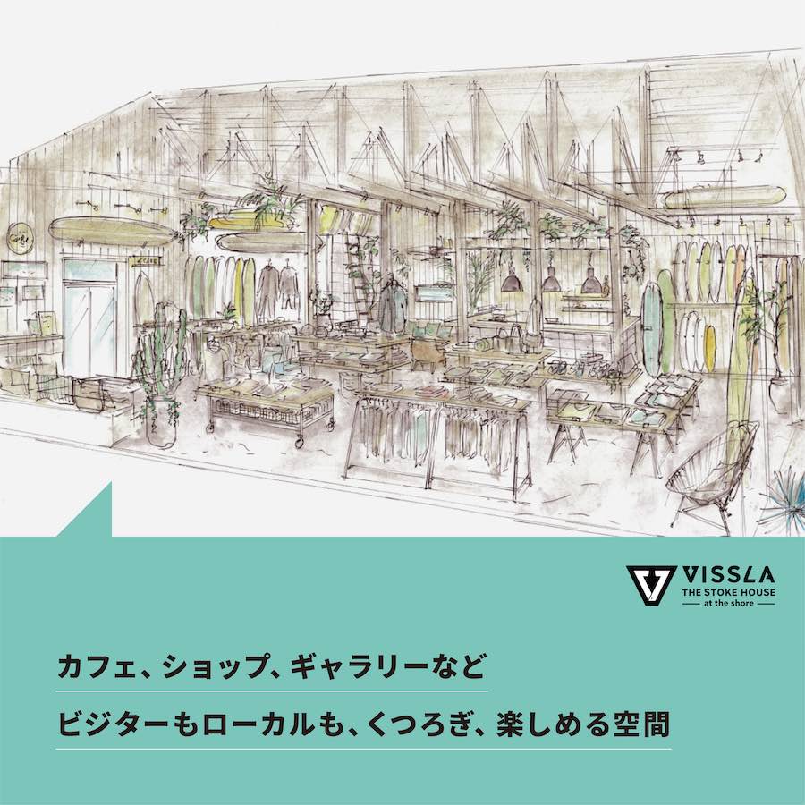 をコンセプトに、VISSLA STOREを中心にボードロッカーやシャワー、更衣室はもちろん、サーフィン前後にくつろげるカフェやギャラリーなども併設。