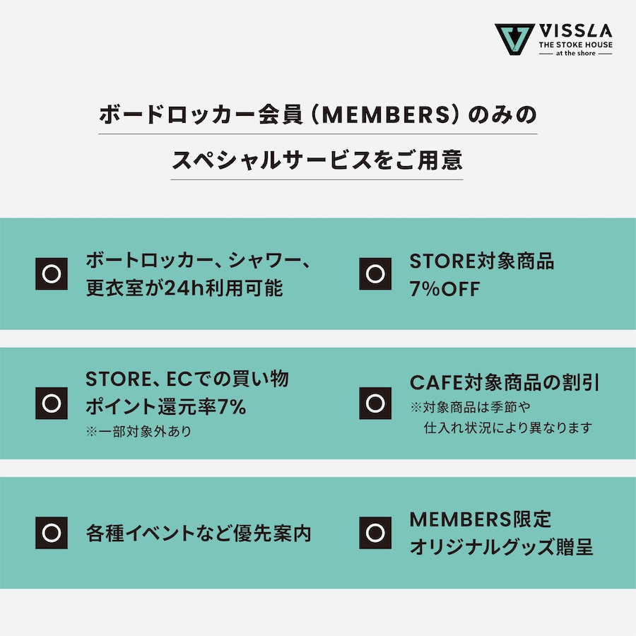 メンバーズになることでウエットスーツも収納できるボードロッカーやシャワー、更衣室が24時間好きな時に使用できる上、STOREやカフェの対象アイテム割引、オフィシャル・オンラインショップでの買い物ポイント還元率7%、メンバー限定オリジナルグッズ贈呈ほか多くのスペシャル特典を体験することが可能となる。