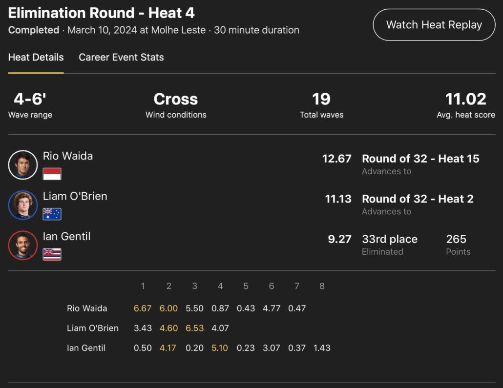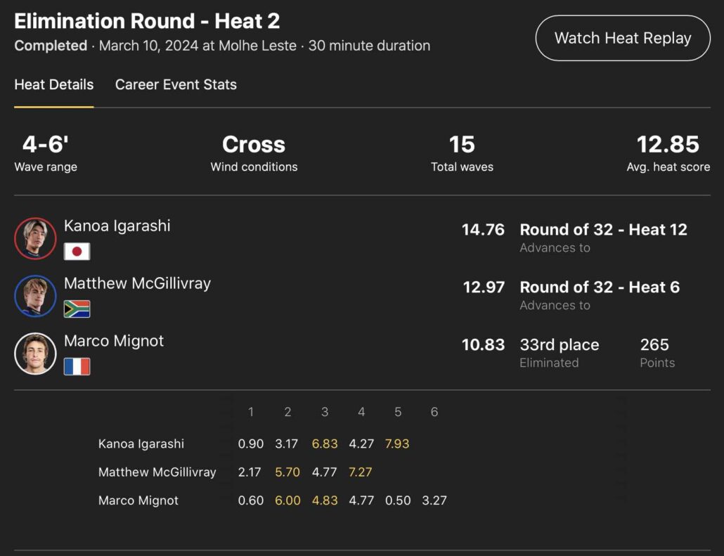 注目の日本人選手の活躍は、イリミネーションラウンドのヒート2に登場した五十嵐カノアが7.93ptという限りなくエクセレントスコアに近いハイスコアを叩き出し、Matthew McGillivrayとMarco Mignotの2名を抑えて見事1位でラウンドアップ!!