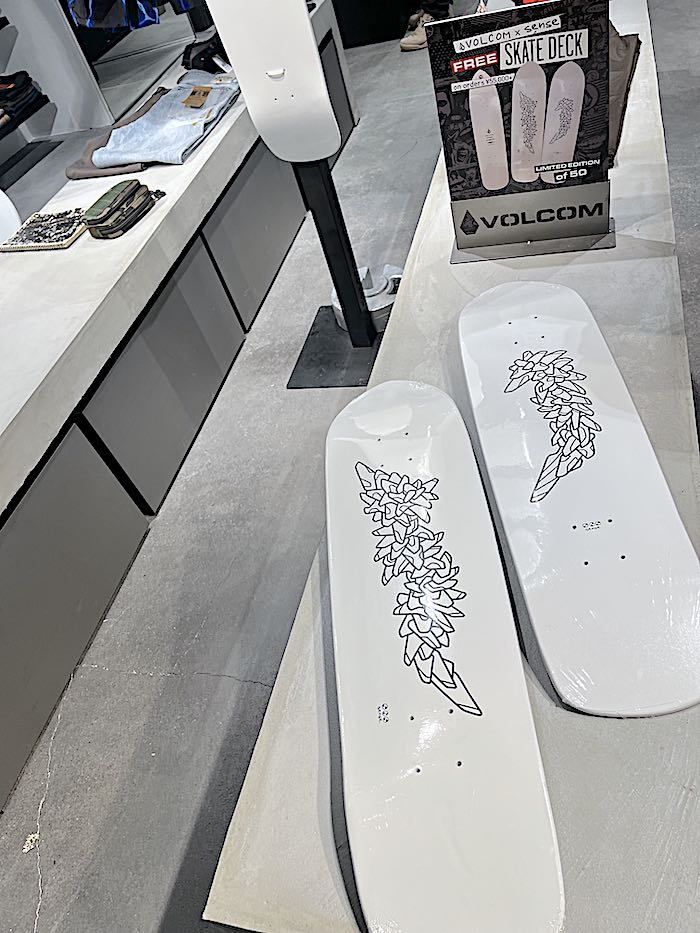 完成した坂巻善徳 a.k.a sense氏 × VOLCOMスケートデッキは非売品となっており、VOLCOM STORE渋谷にて¥55,000以上お買い物した客様に先着でプレゼントされる。